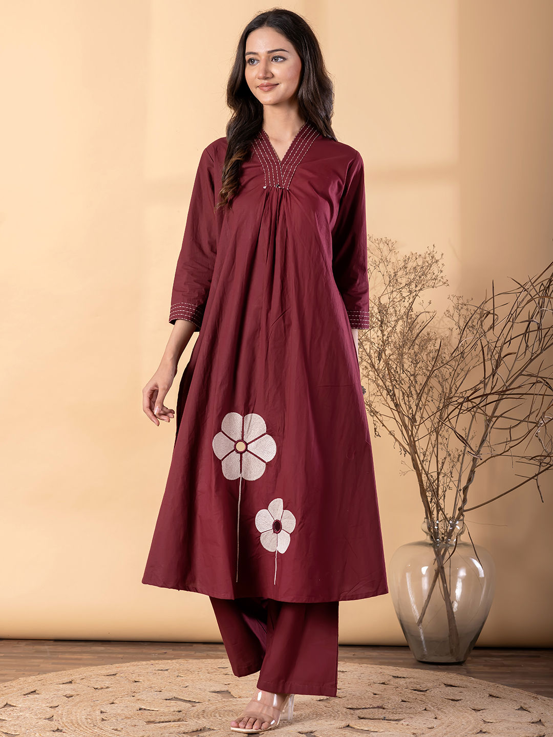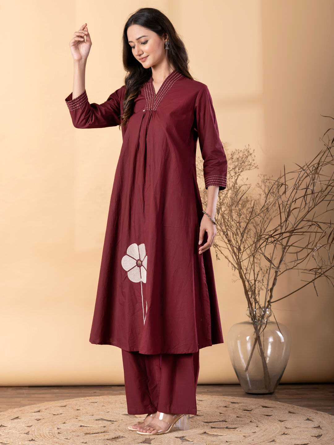 A-Line Style Cotton Fabric Maroon Color Embroidered Work Kurti With Palazzo