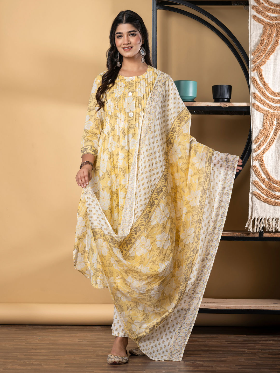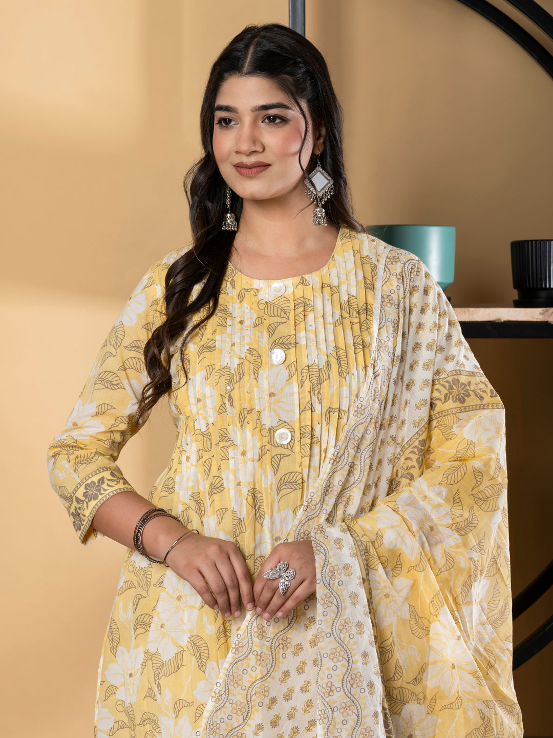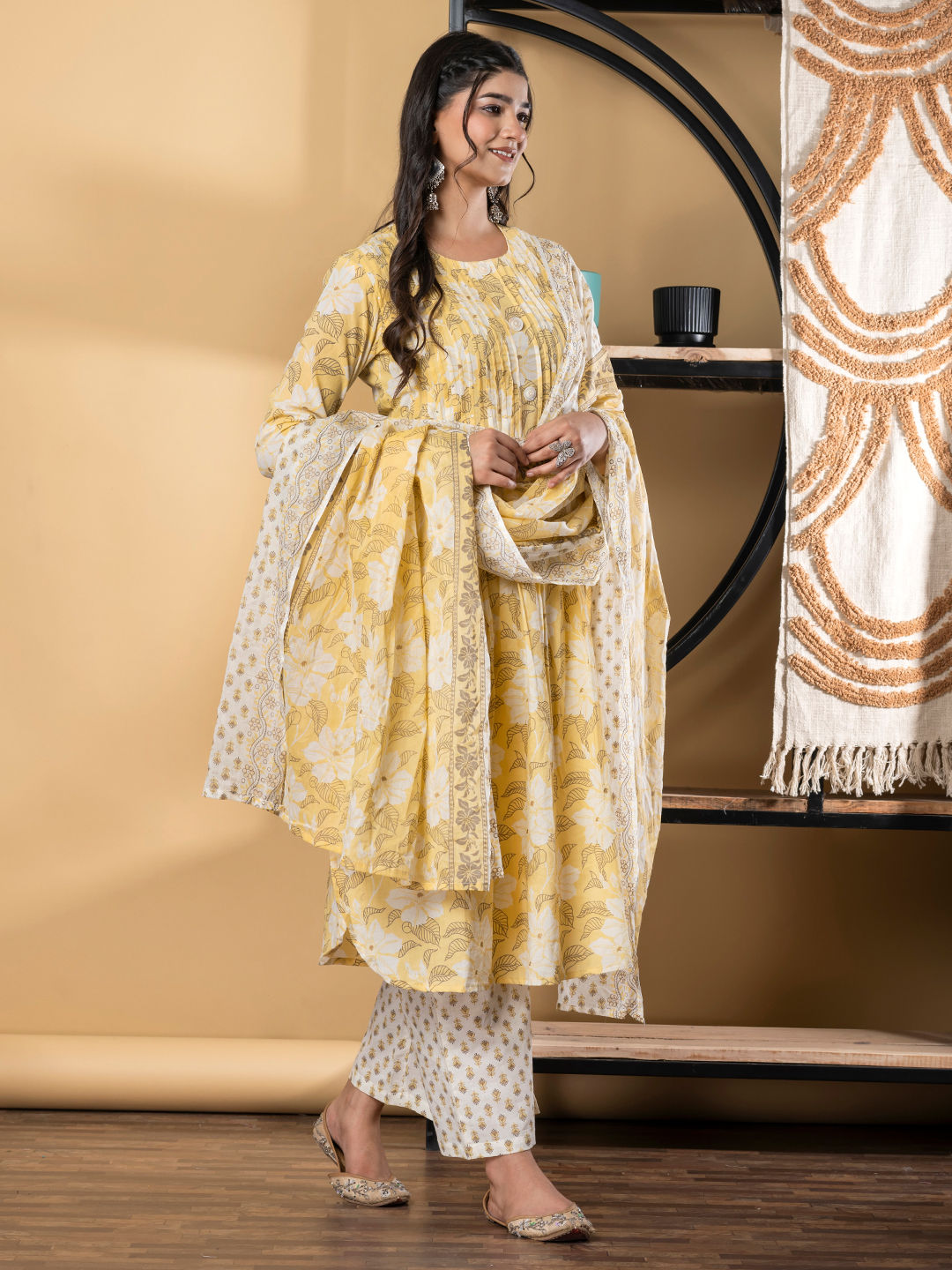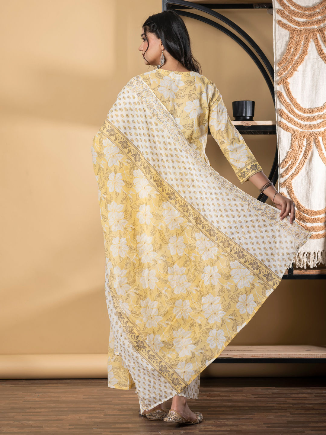 A Line Style Cotton Fabric Yellow Color Floral Printed & Sequence Work Kurti With Palazzo And Dupatta