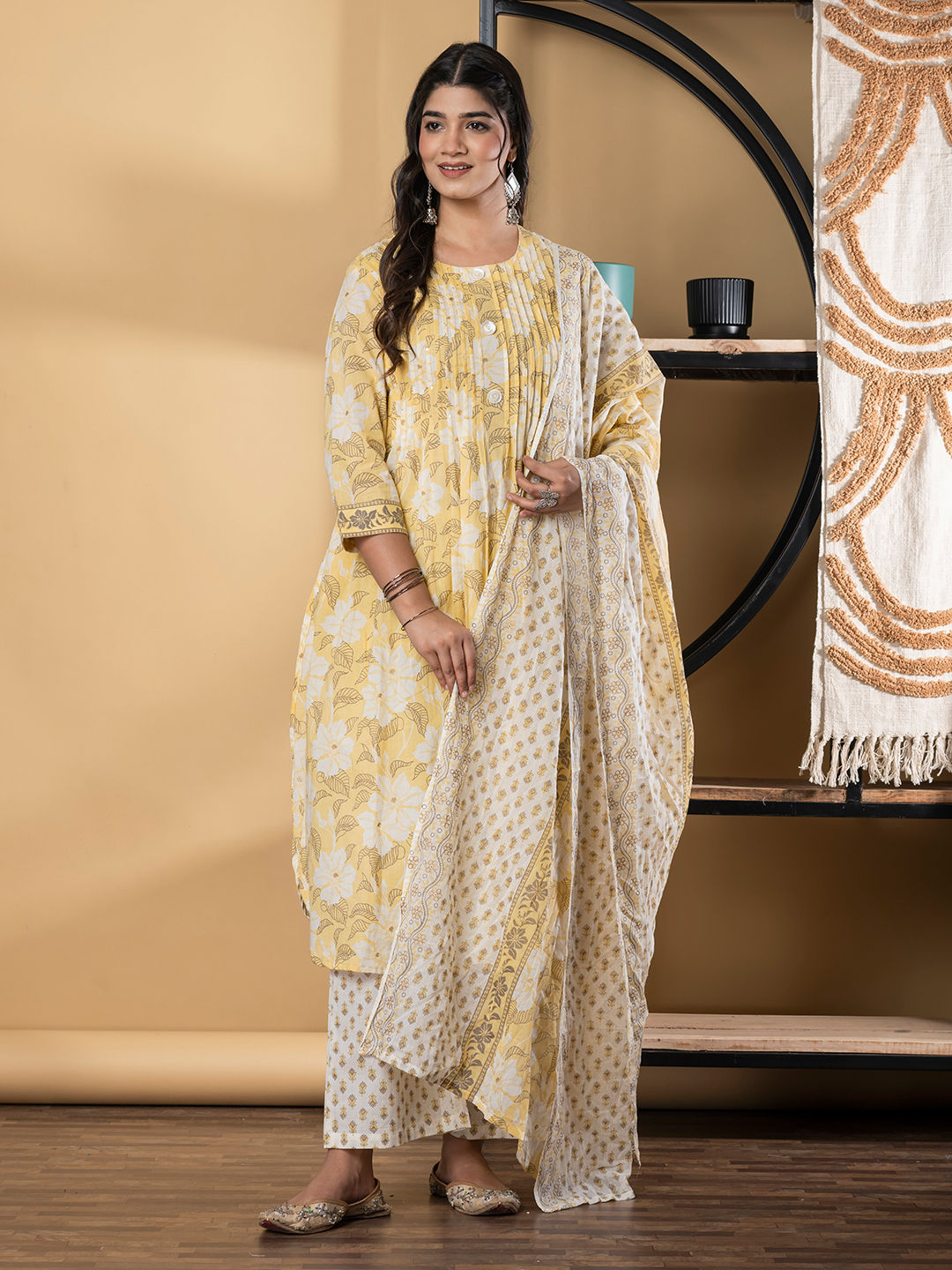 A line style cotton fabric yellow color kurta and bottom with dupatta