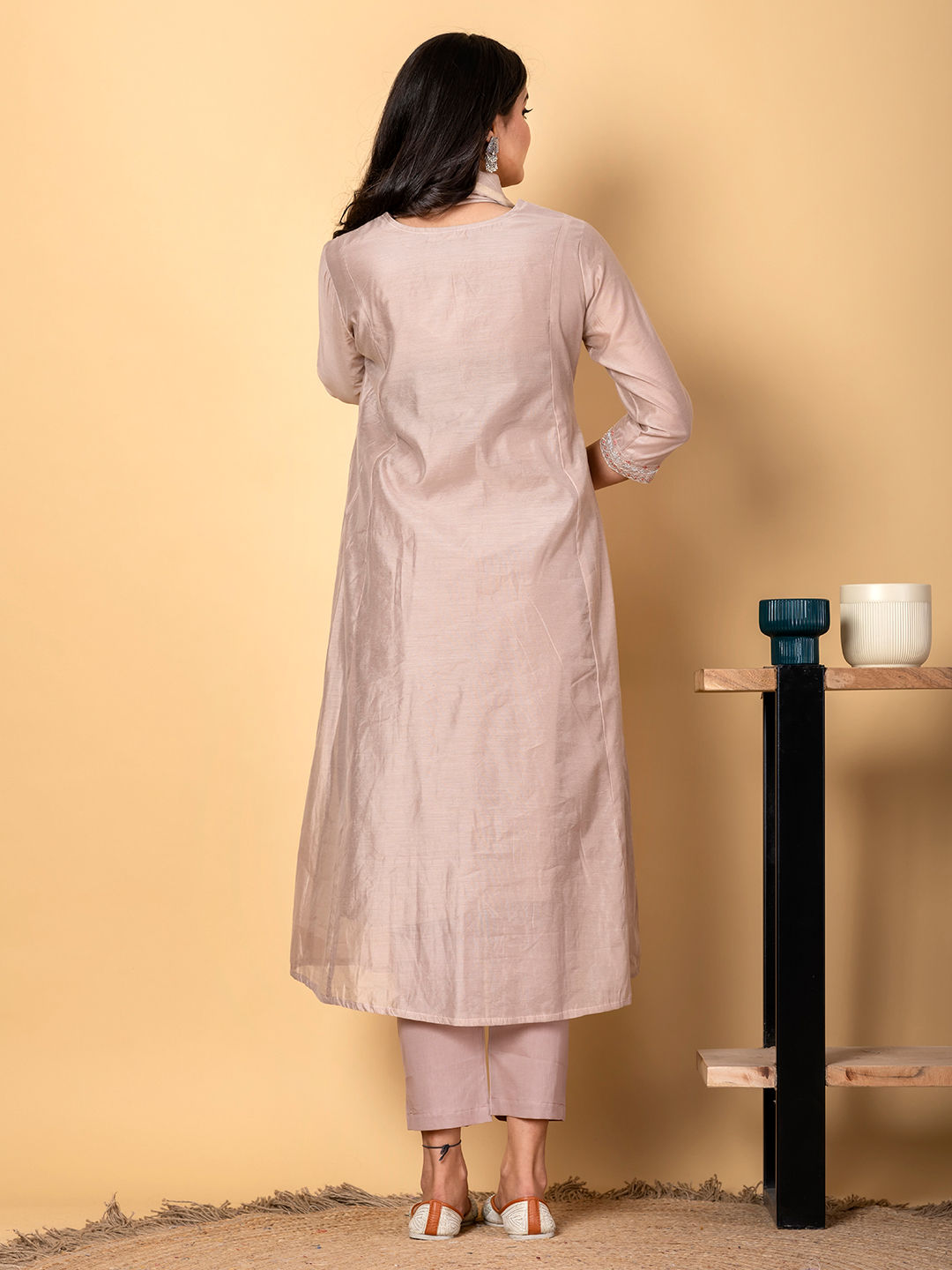 Anarkali style chanderi silk fabric beige color kurta and bottom with dupatta