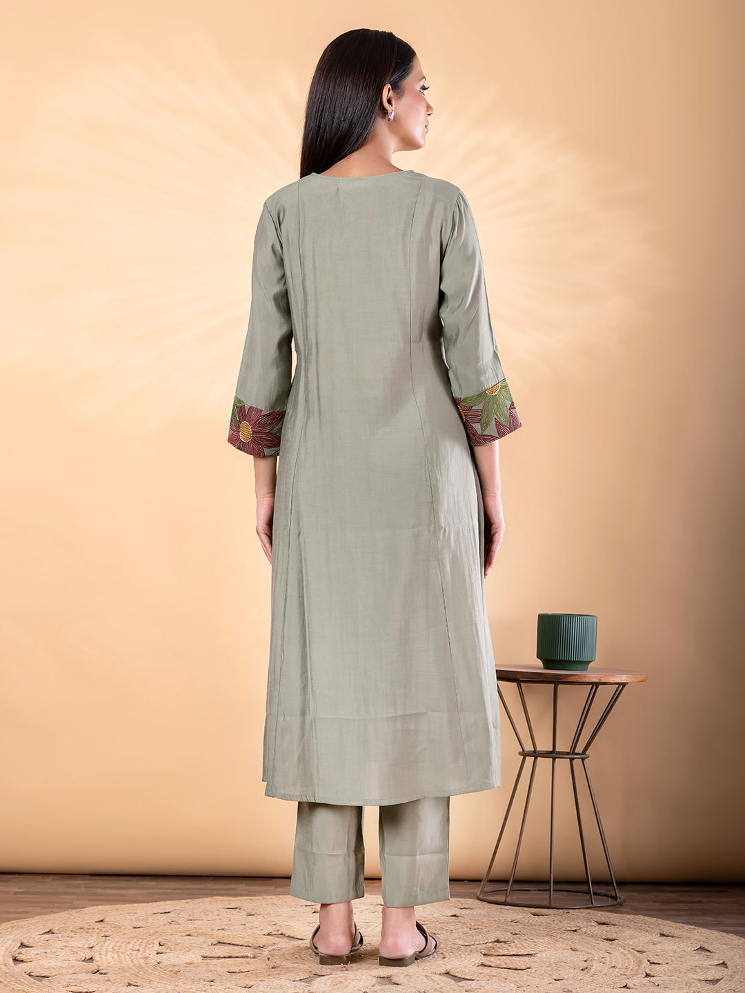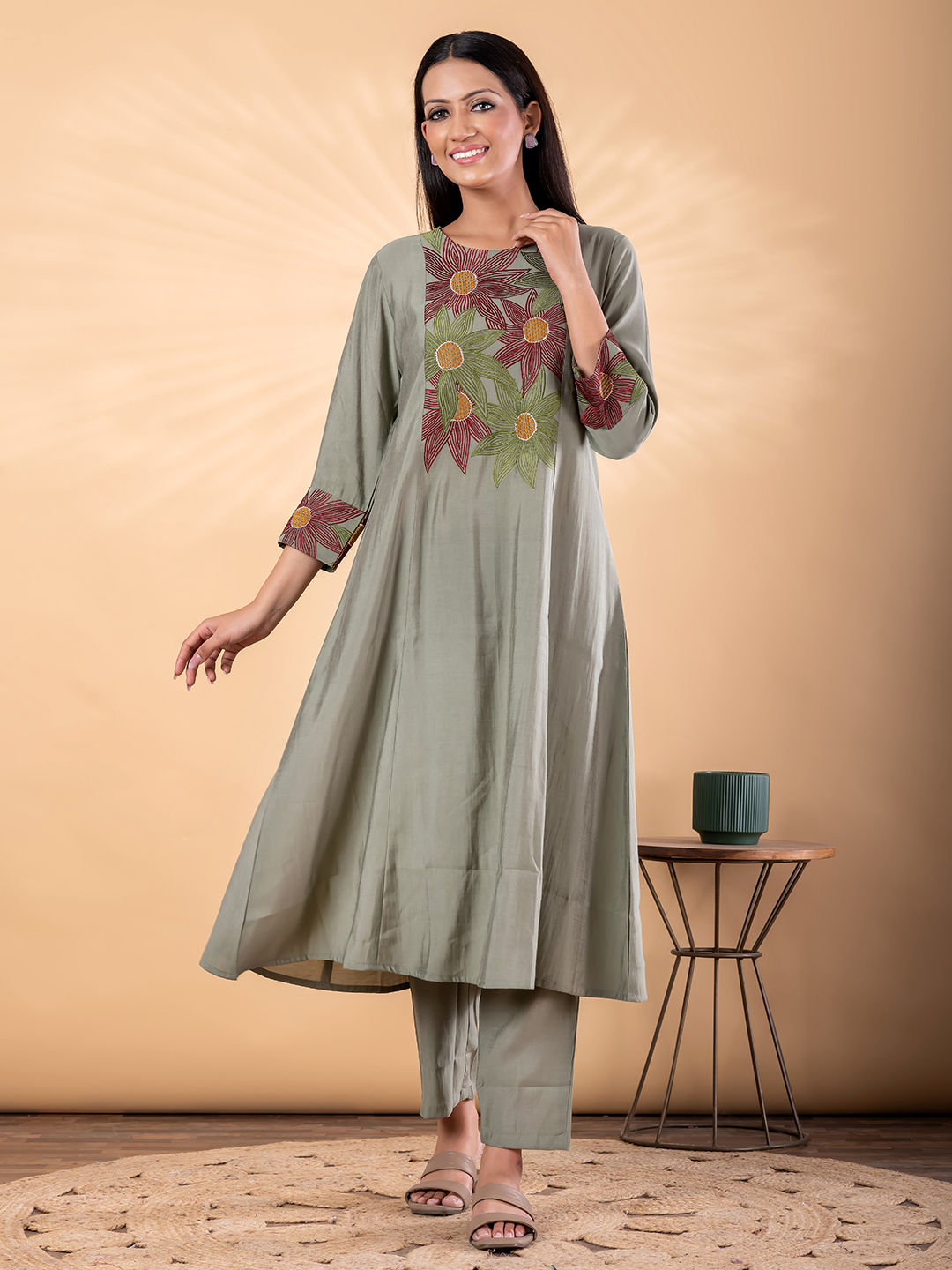 Anarkali Style Chinon Silk Fabric Green Color Embroidered & Resham Work Kurti With Palazzo