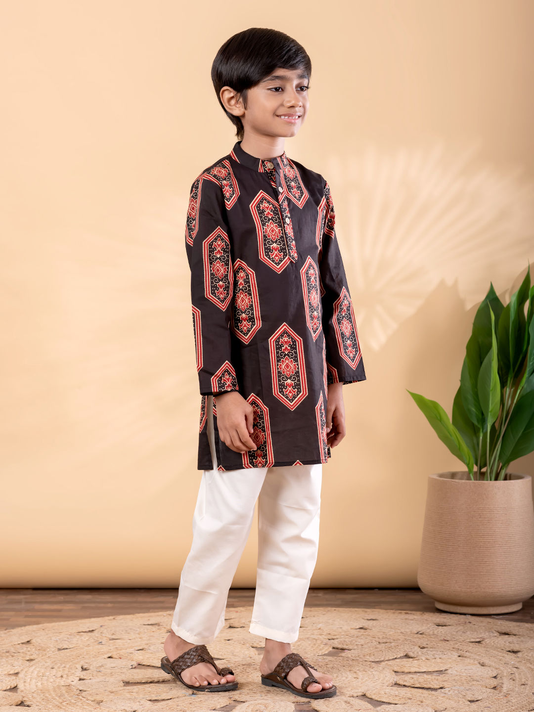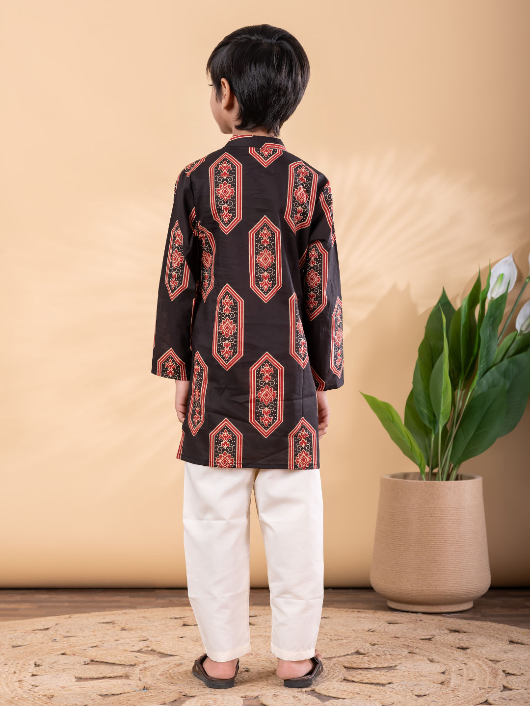 Boys Straight Style Cotton Fabric Brown Color Printed Kurta With Pyjama