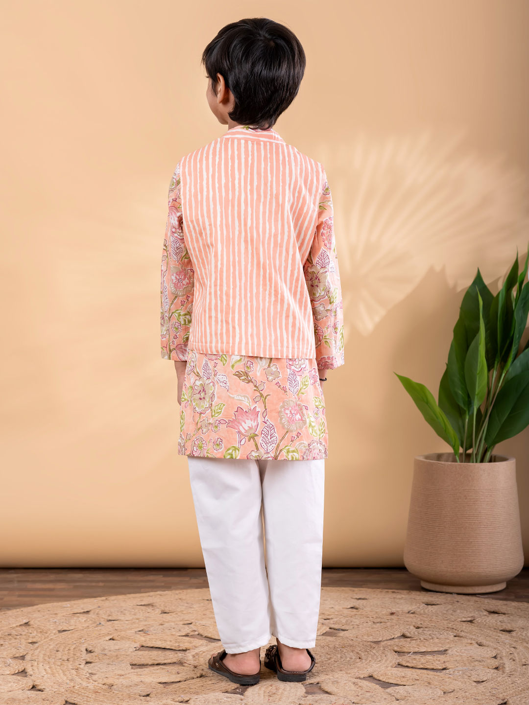 Boys Straight Style Cotton Fabric Peach Color Floral Printed Kurta And Pyjama With Nehru Jacket