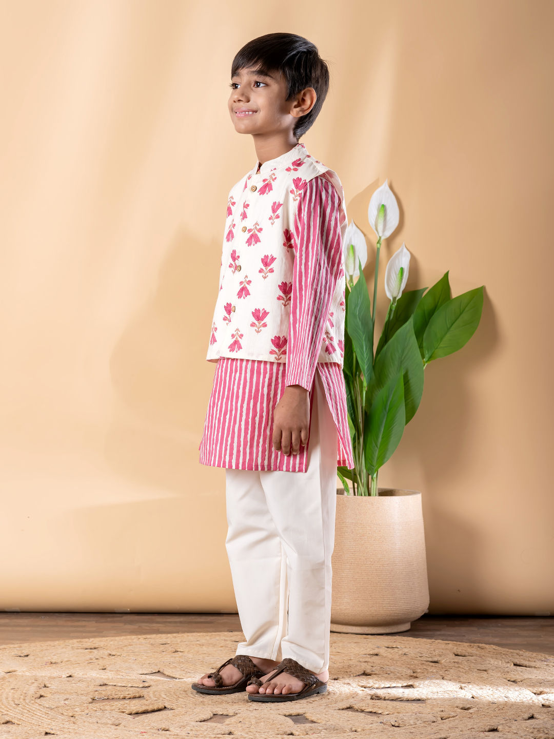 Boys Straight Style Cotton Fabric Pink Color Floral Printed Kurta And Pyjama With Nehru Jacket