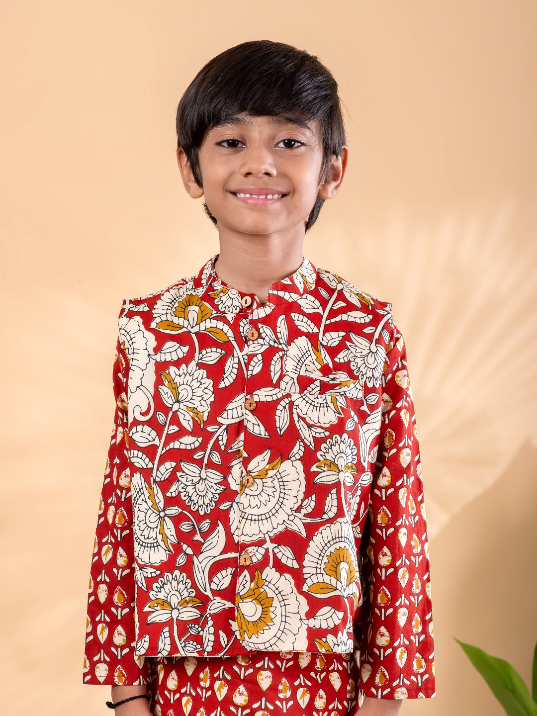 Boys Straight Style Cotton Fabric Red Color Printed Kurta And Pyjama With Nehru Jacket