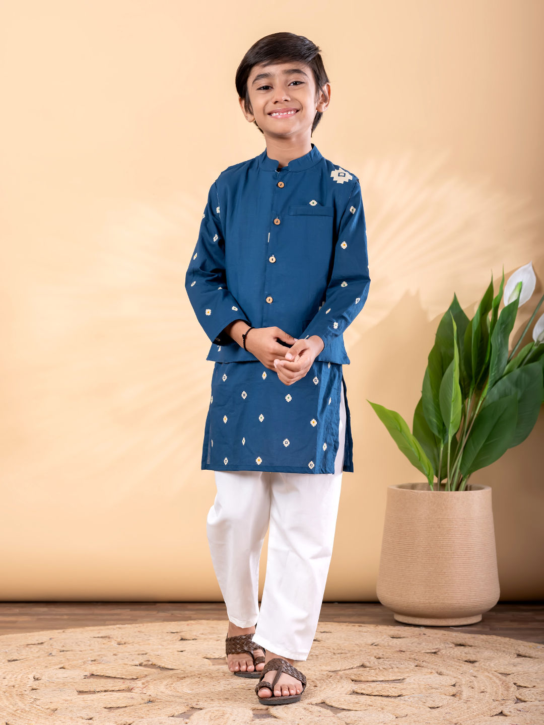 Boys straight style cotton fabric teal color kurta and pyjama with nehru jacket