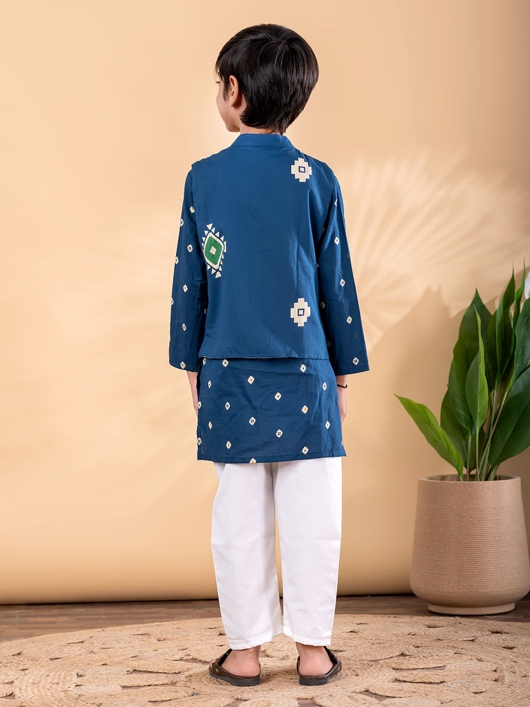 Boys Straight Style Cotton Fabric Teal Color Printed Kurta And Pyjama With Nehru Jacket