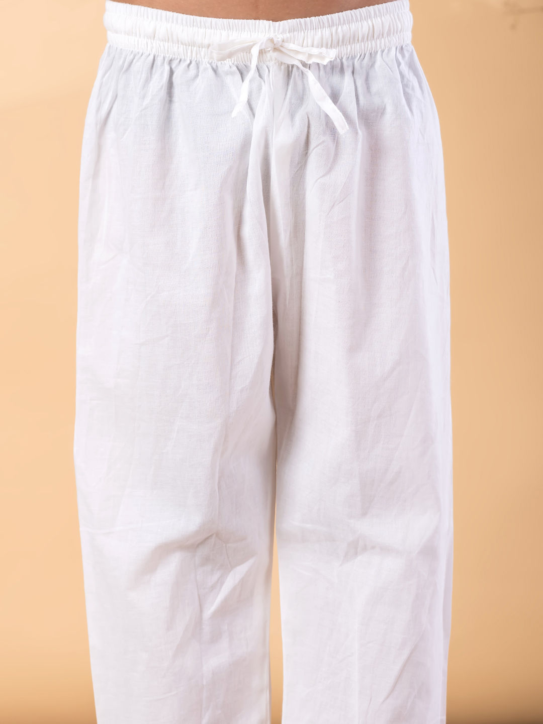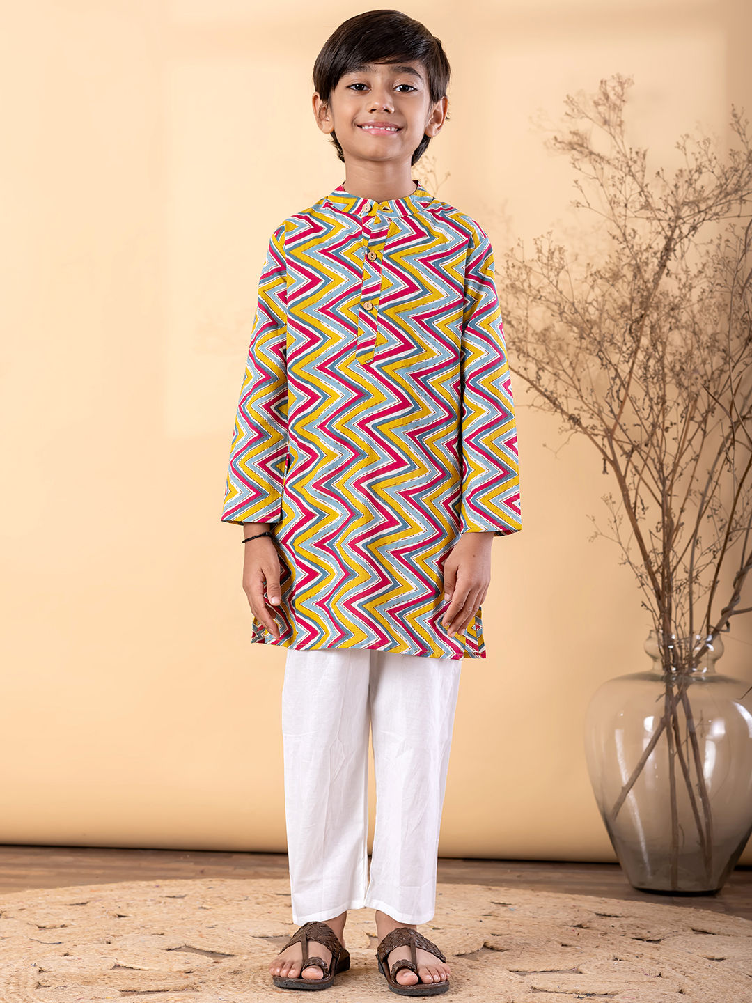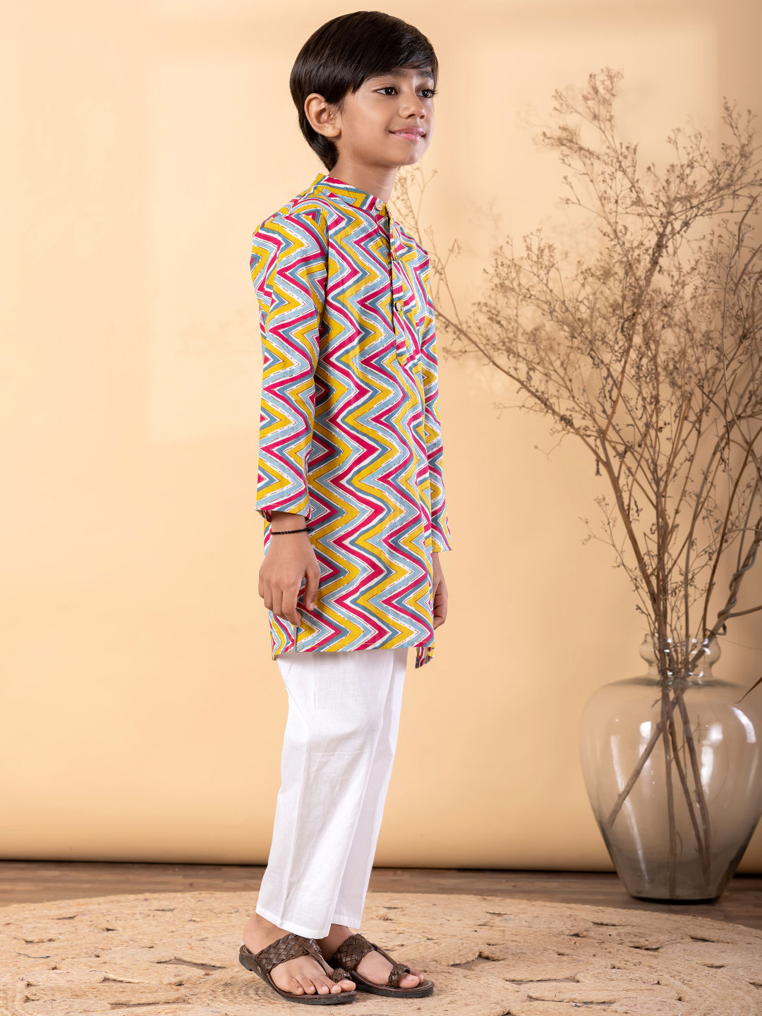 Boys Straight Style Cotton Fabric White Color Zig Zag Printed Kurta With Pyjama