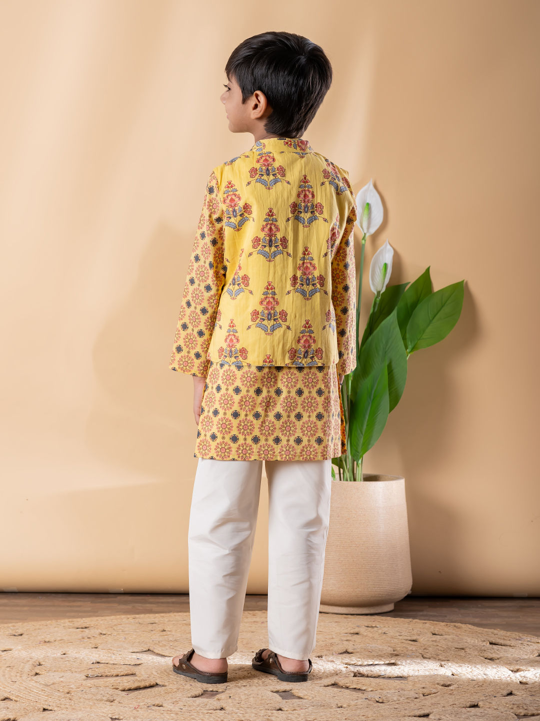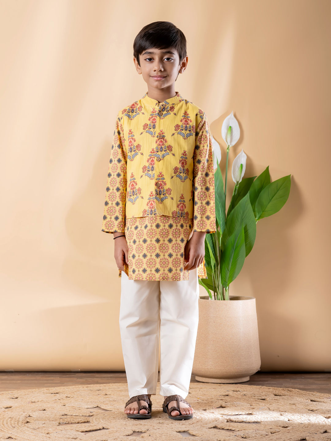 Boys Straight Style Cotton Fabric Yellow Color Floral Printed Kurta And Pyjama With Nehru Jacket