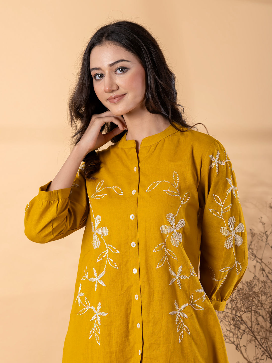 Women Curved Style Cotton Flex Fabric Yellow Color Embroidered Work Kurta And Bottom
