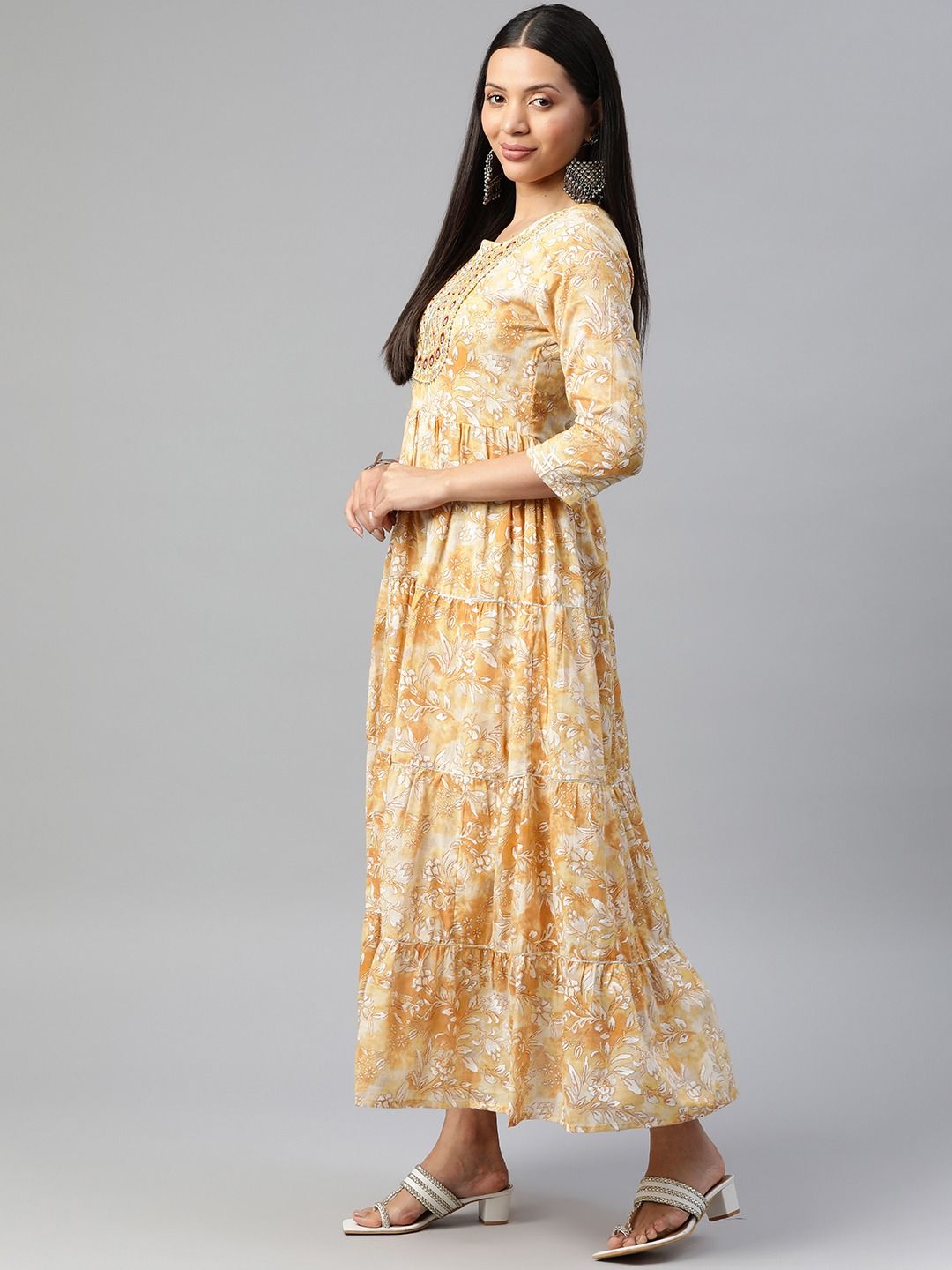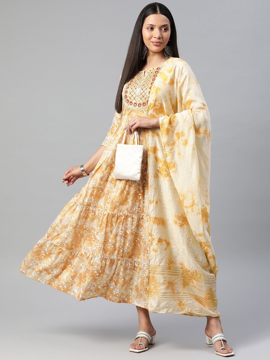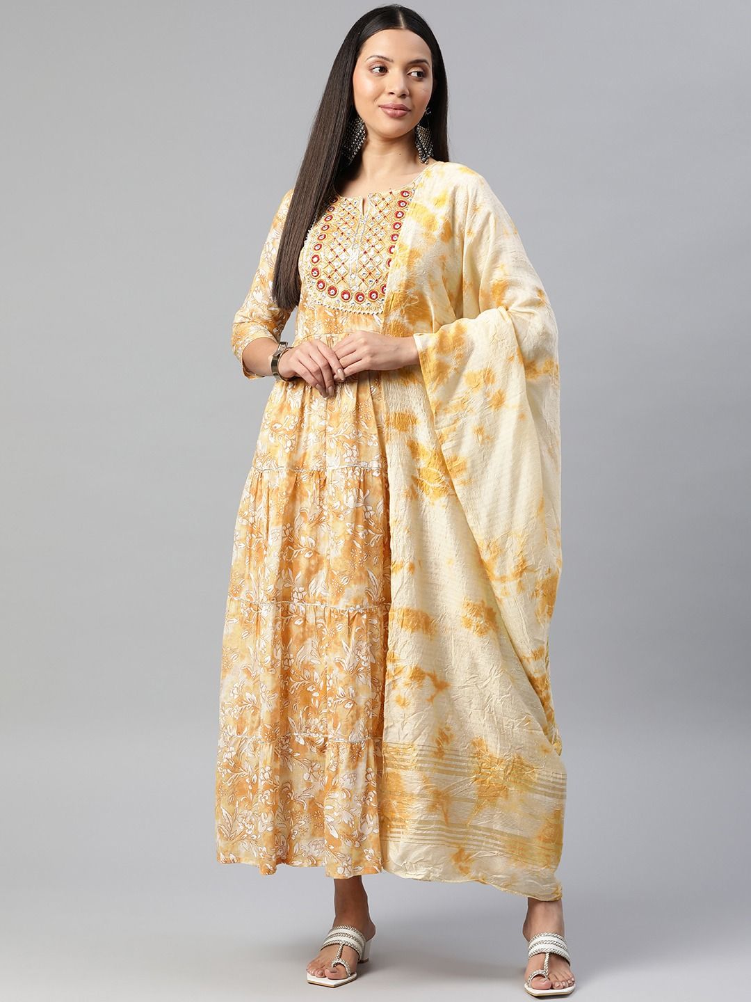 Mustard color cotton fabric tiered gown with dupatta