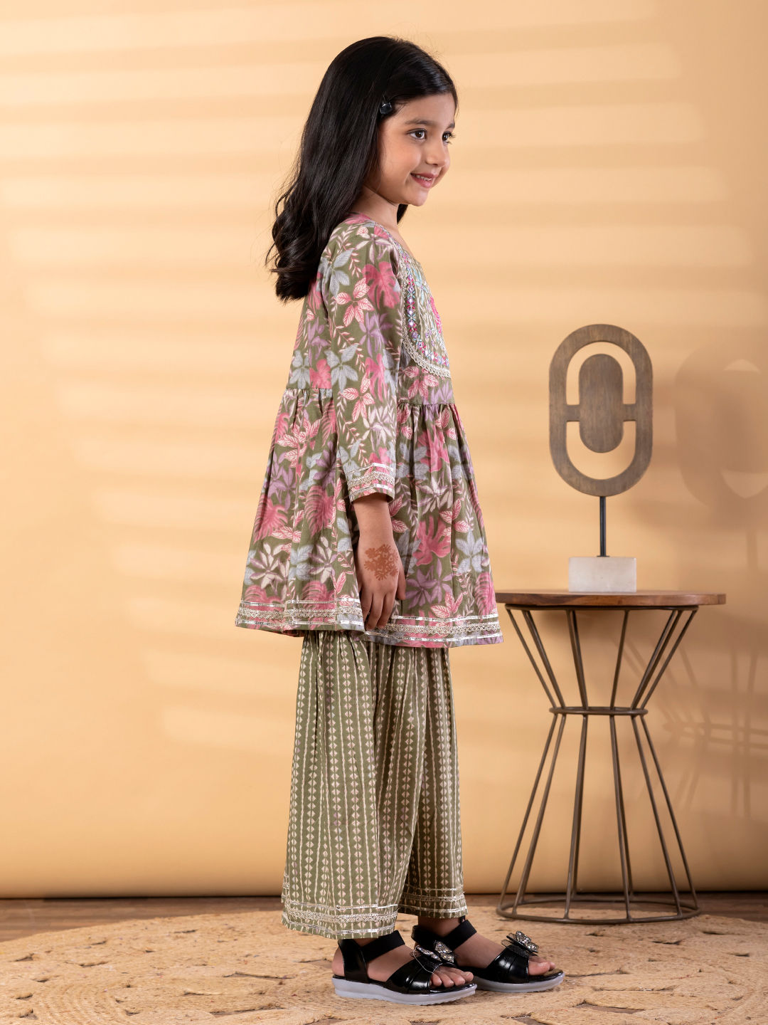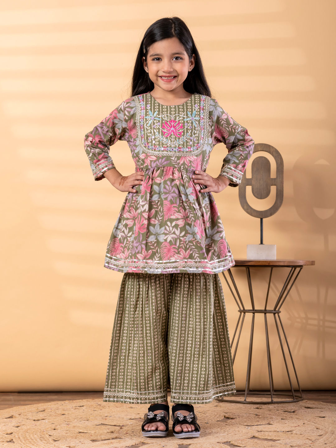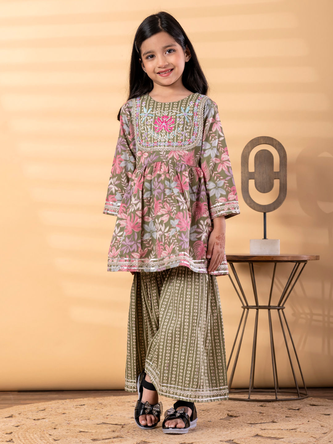 Girls Peplum Style Cotton Fabric Green Color Floral Printed & Embroidered Work Kurti And Sharara