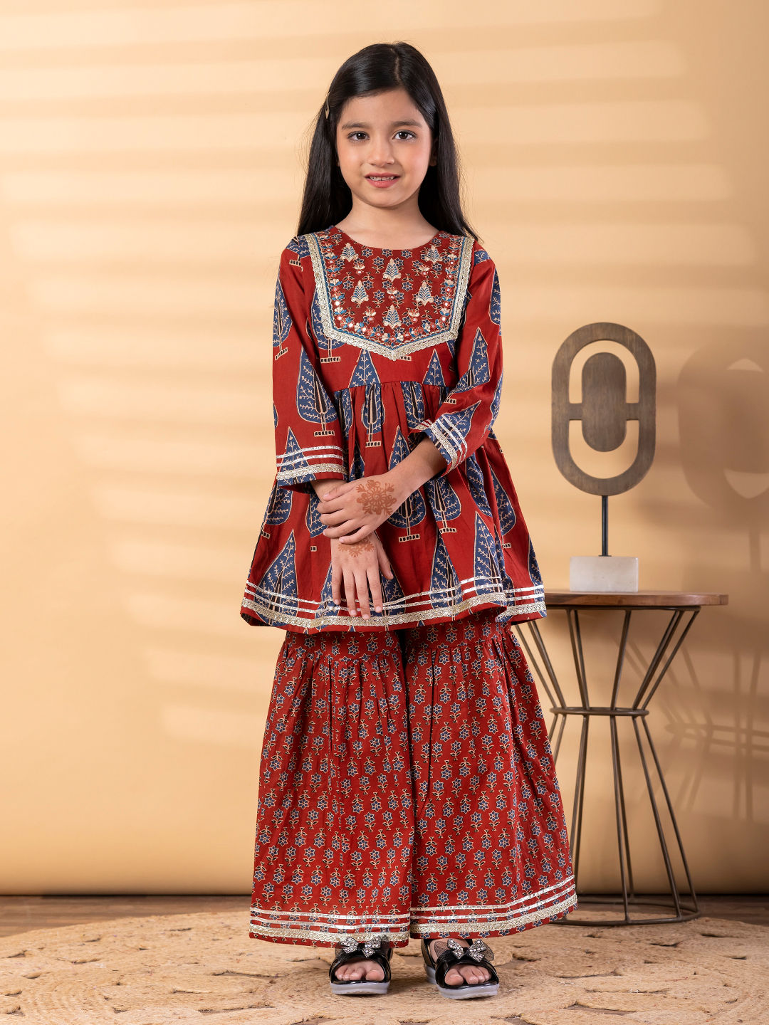 Girls Peplum Style Cotton Fabric Maroon Color Floral Printed & Zari Embroidered Work Kurti And Sharara