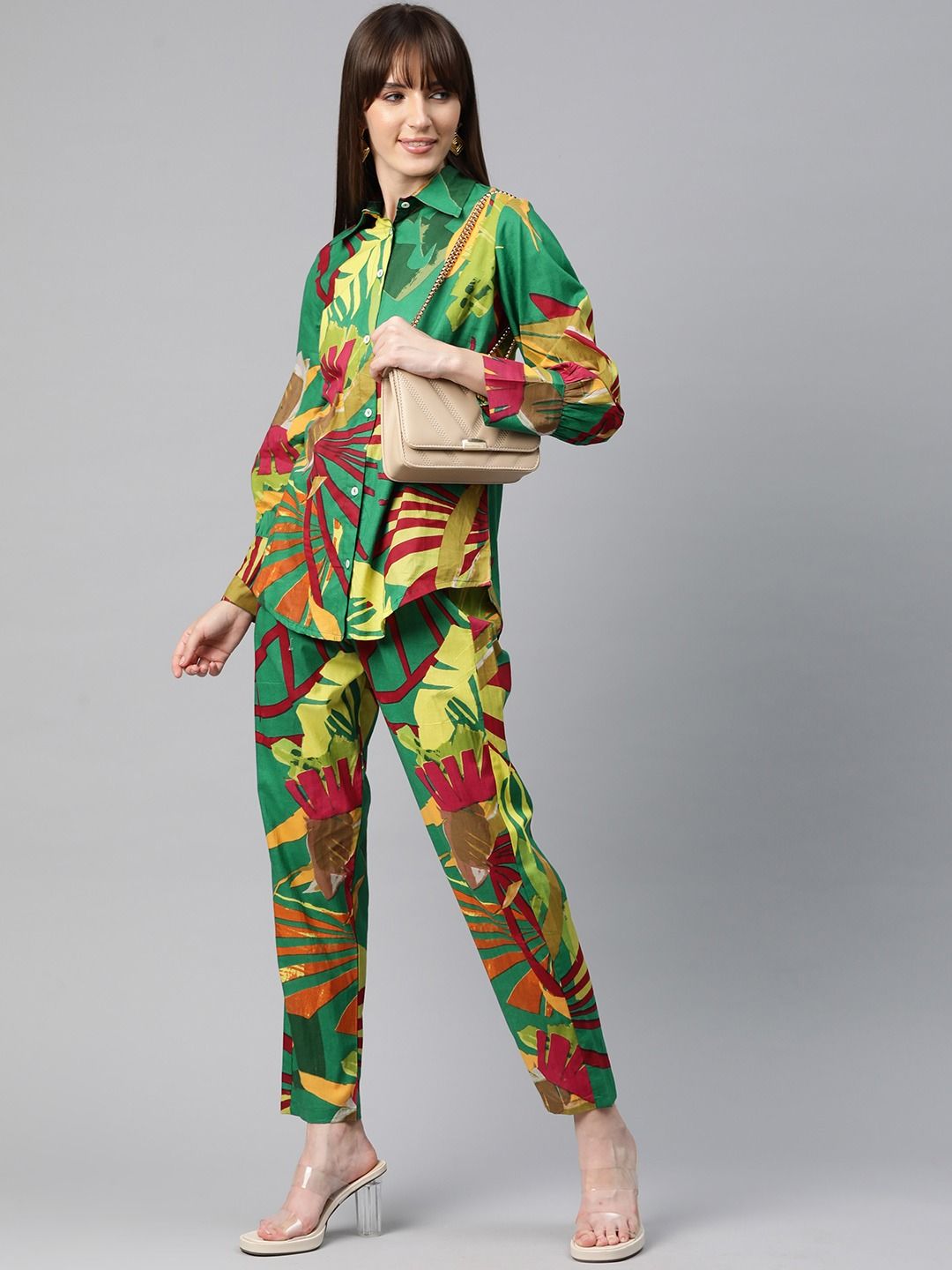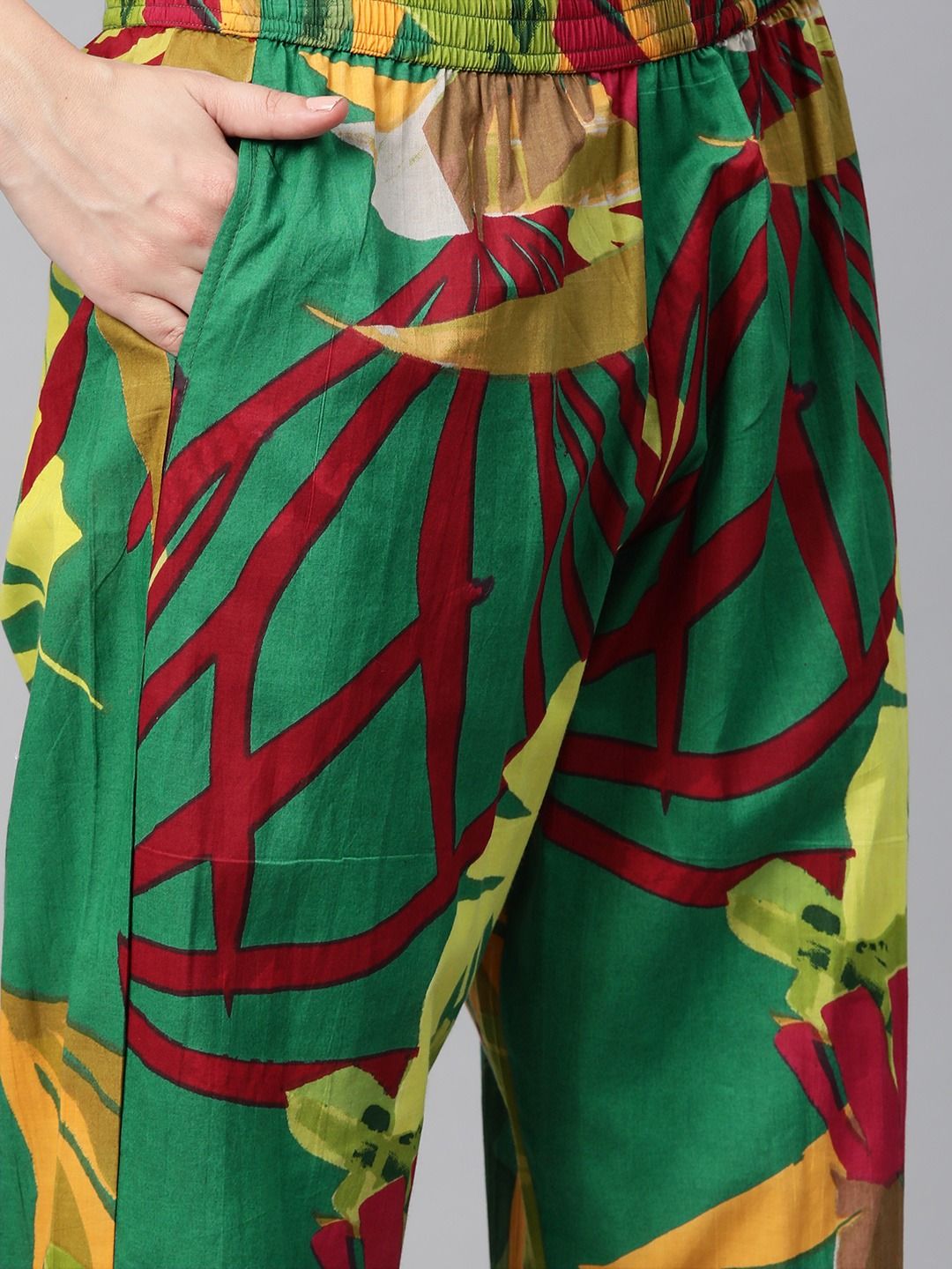 Shirt style Cotton fabric Printed Green color Top with Printed Bottom