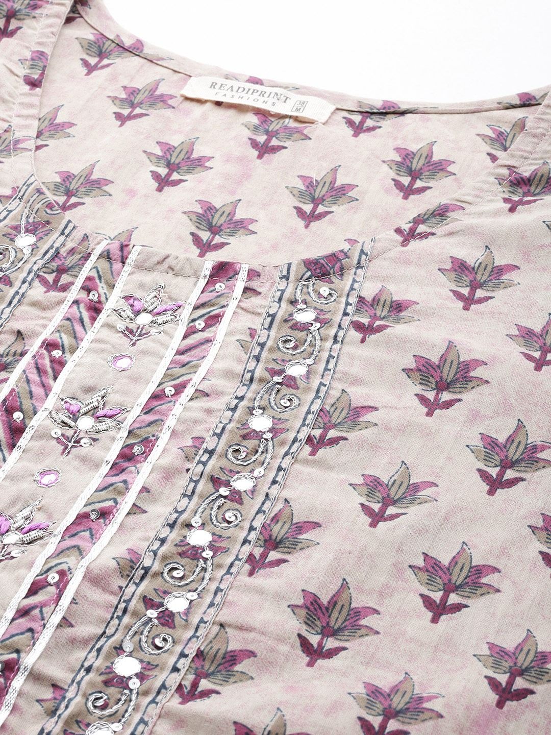 Straight style Cotton fabric Grey color Floral printed kurti with Zari, Sequence and Mirror work with Palazzo and Dupatta