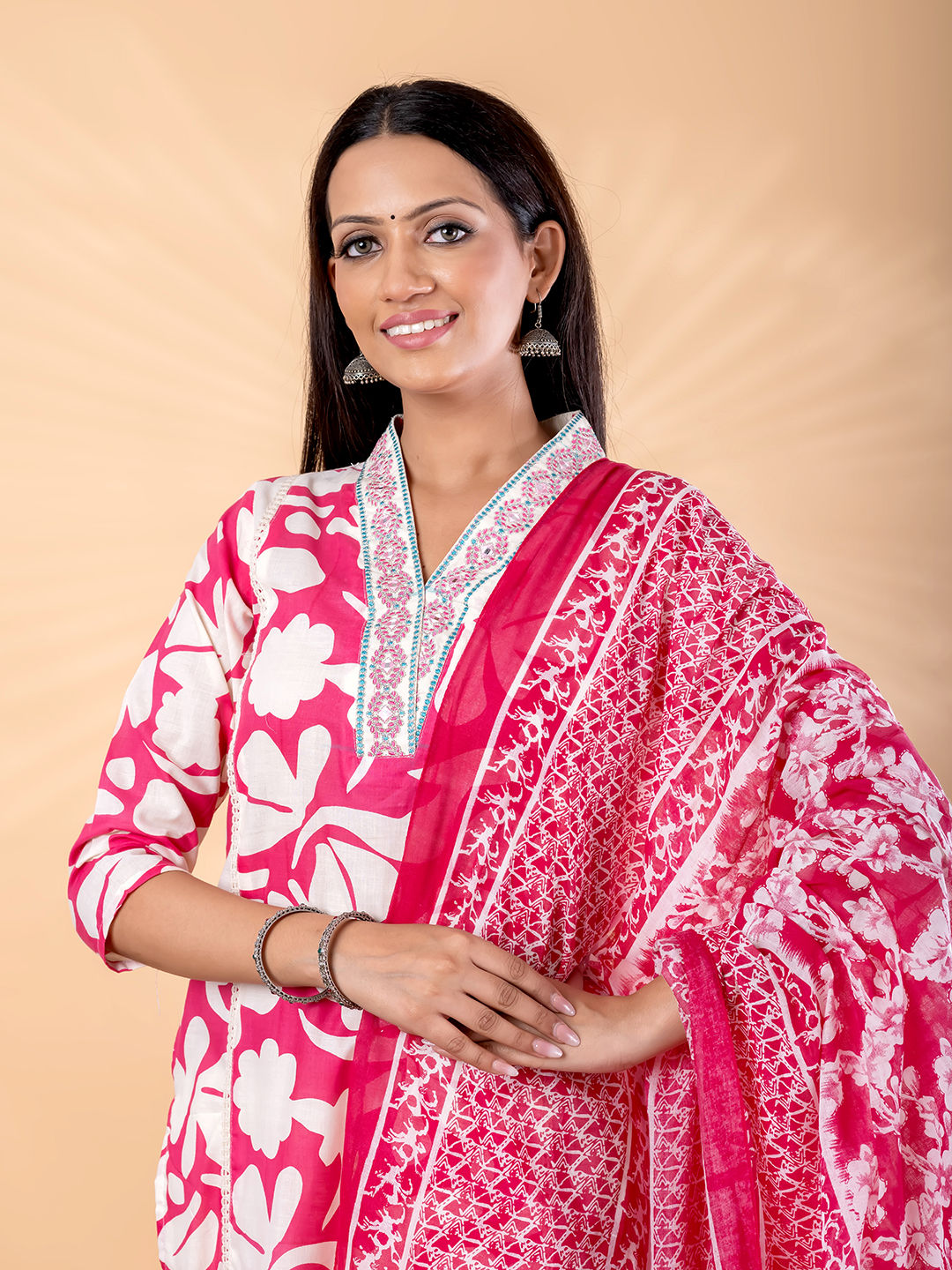Straight Style Cotton Blend Fabric Pink Color Printed & Embroidered Work Kurti With Palazzo And Dupatta
