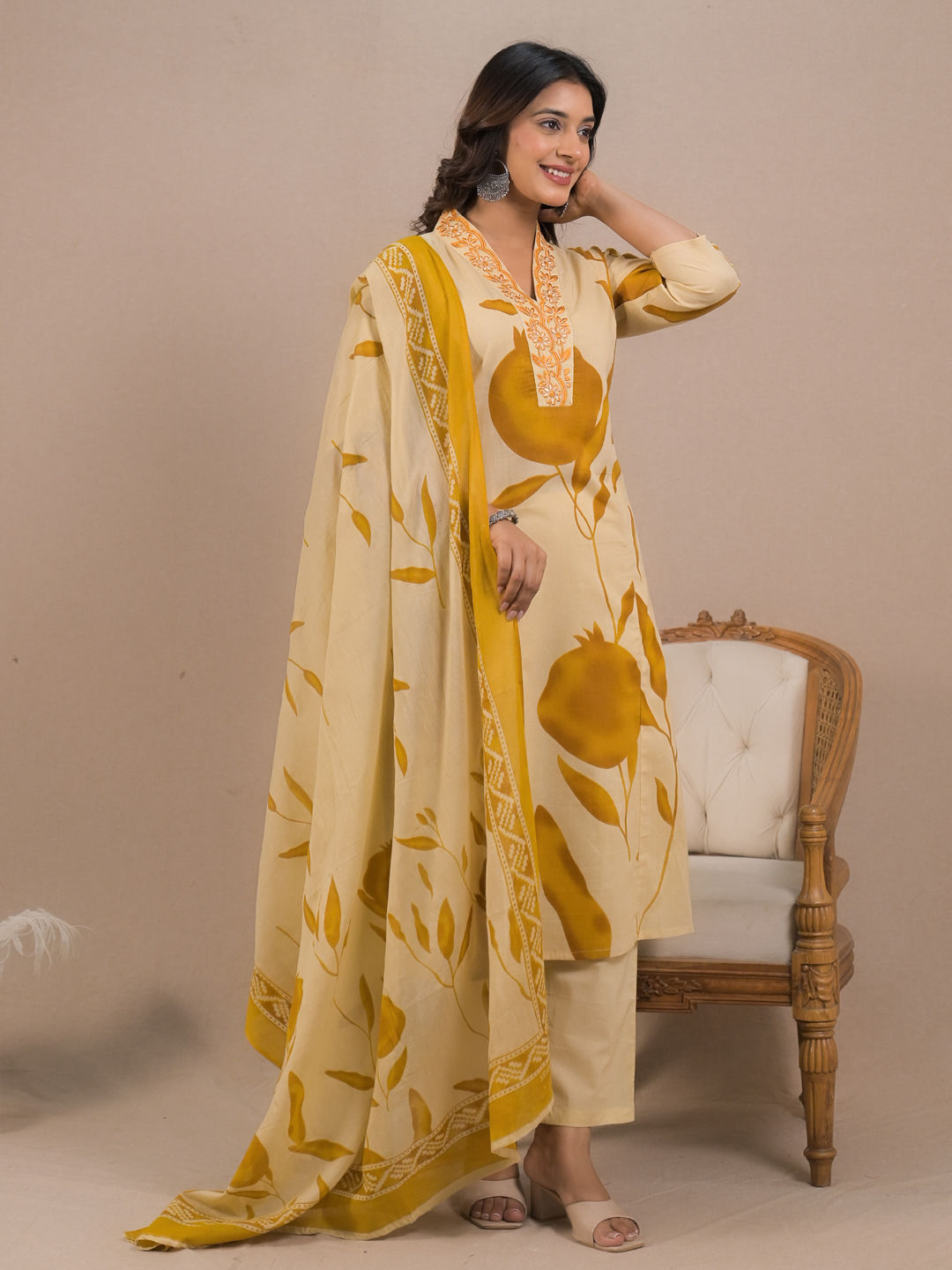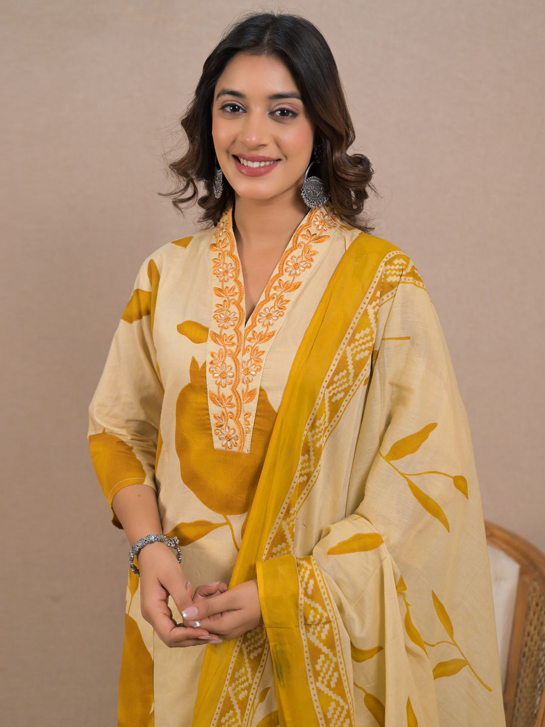 Straight Style Cotton Fabric Beige Color Printed & Embroidered Work Kurti With Palazzo And Dupatta