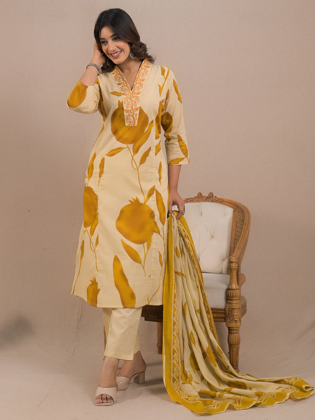 Straight style cotton fabric beige color kurta and bottom with dupatta
