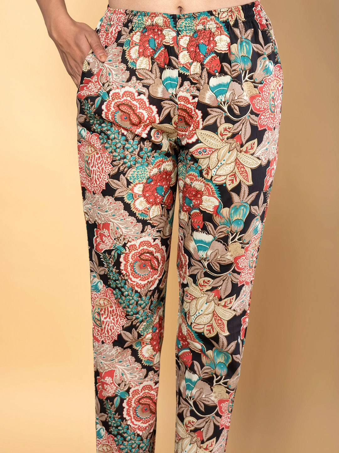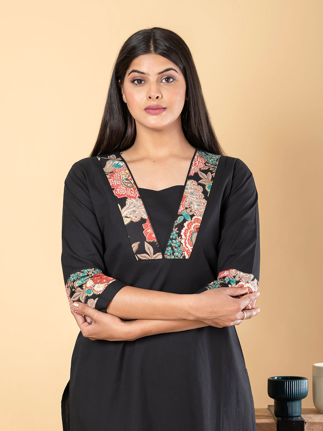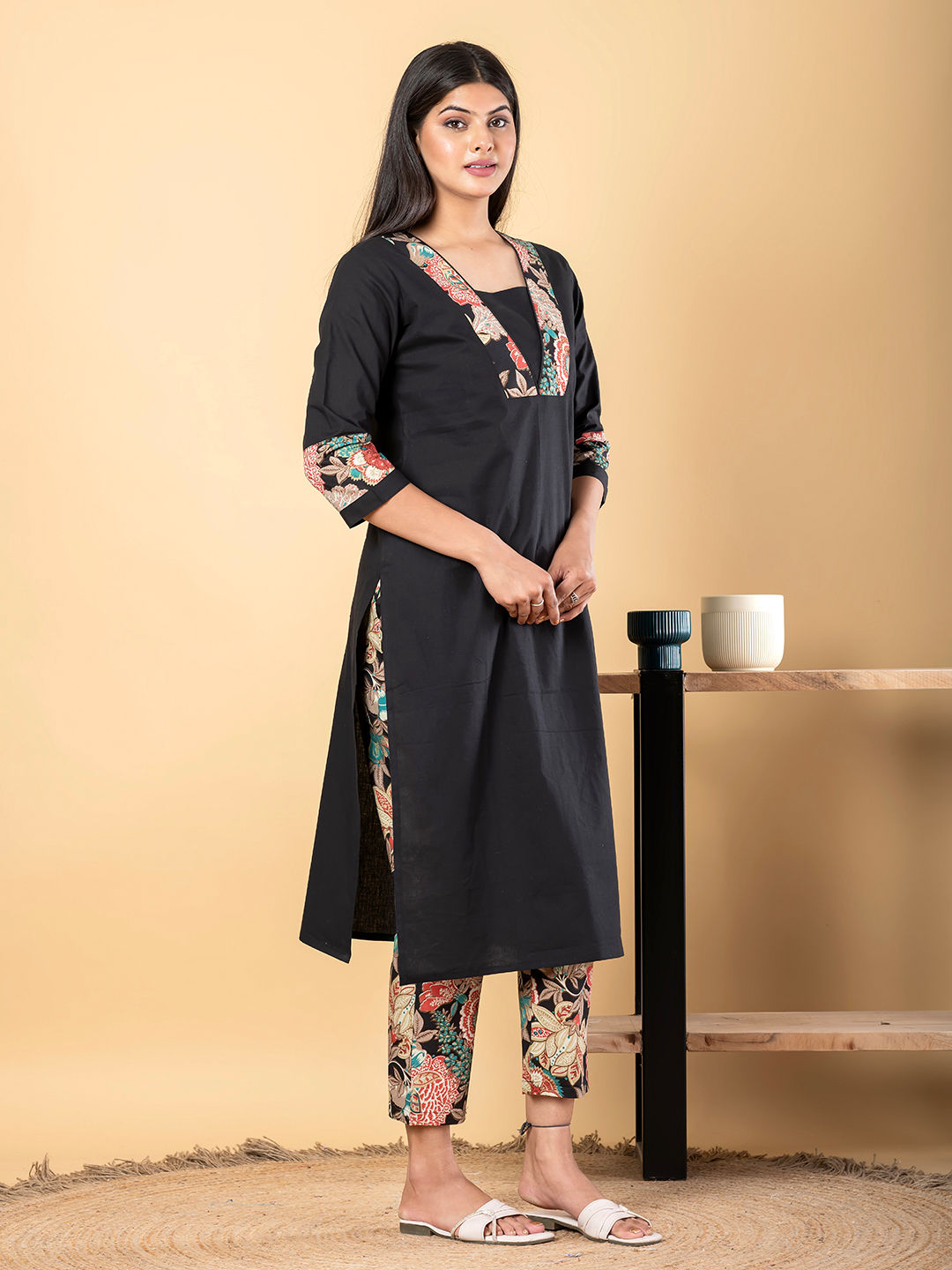 Straight Style Cotton Fabric Black Color Floral Printed Kurti With Palazzo
