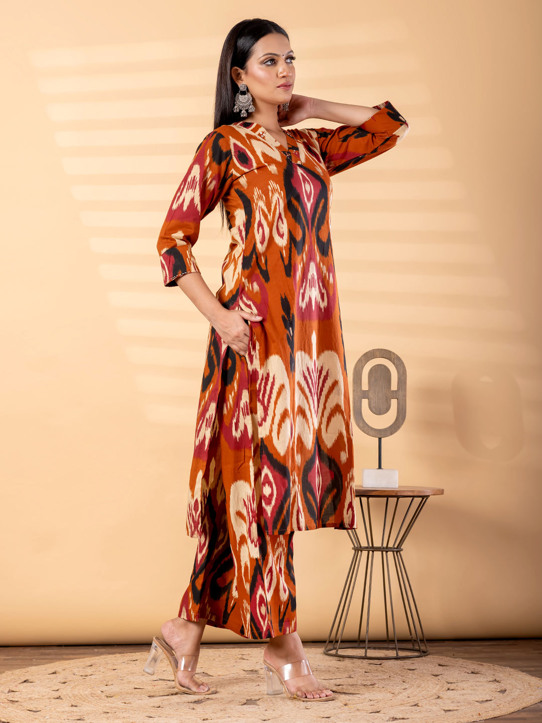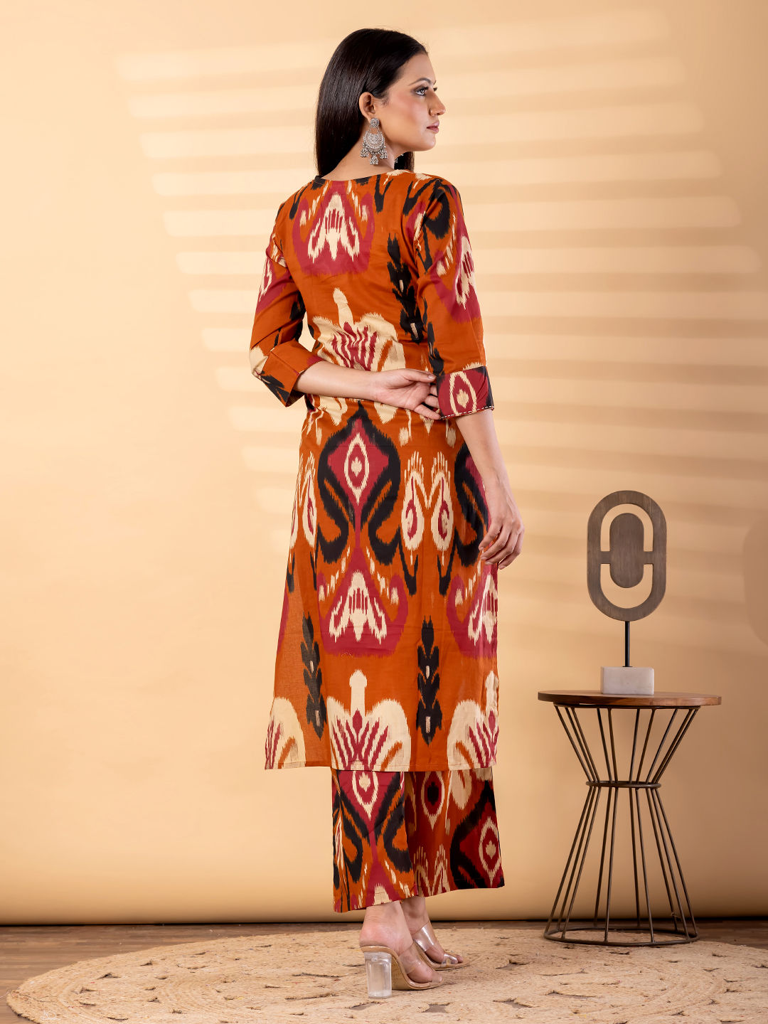 Straight Style Cotton Fabric Brown Color Printed Kurti With Palazzo
