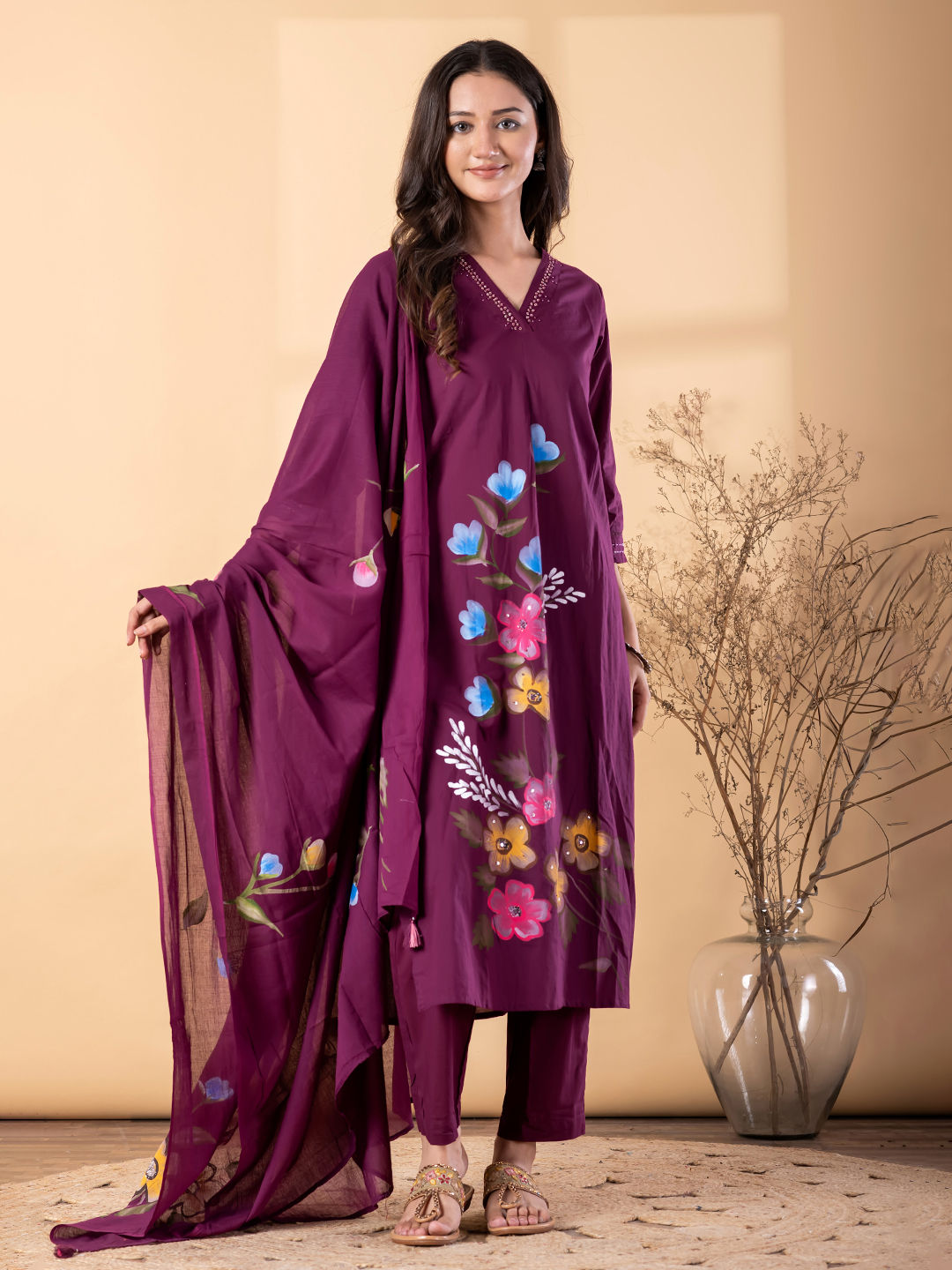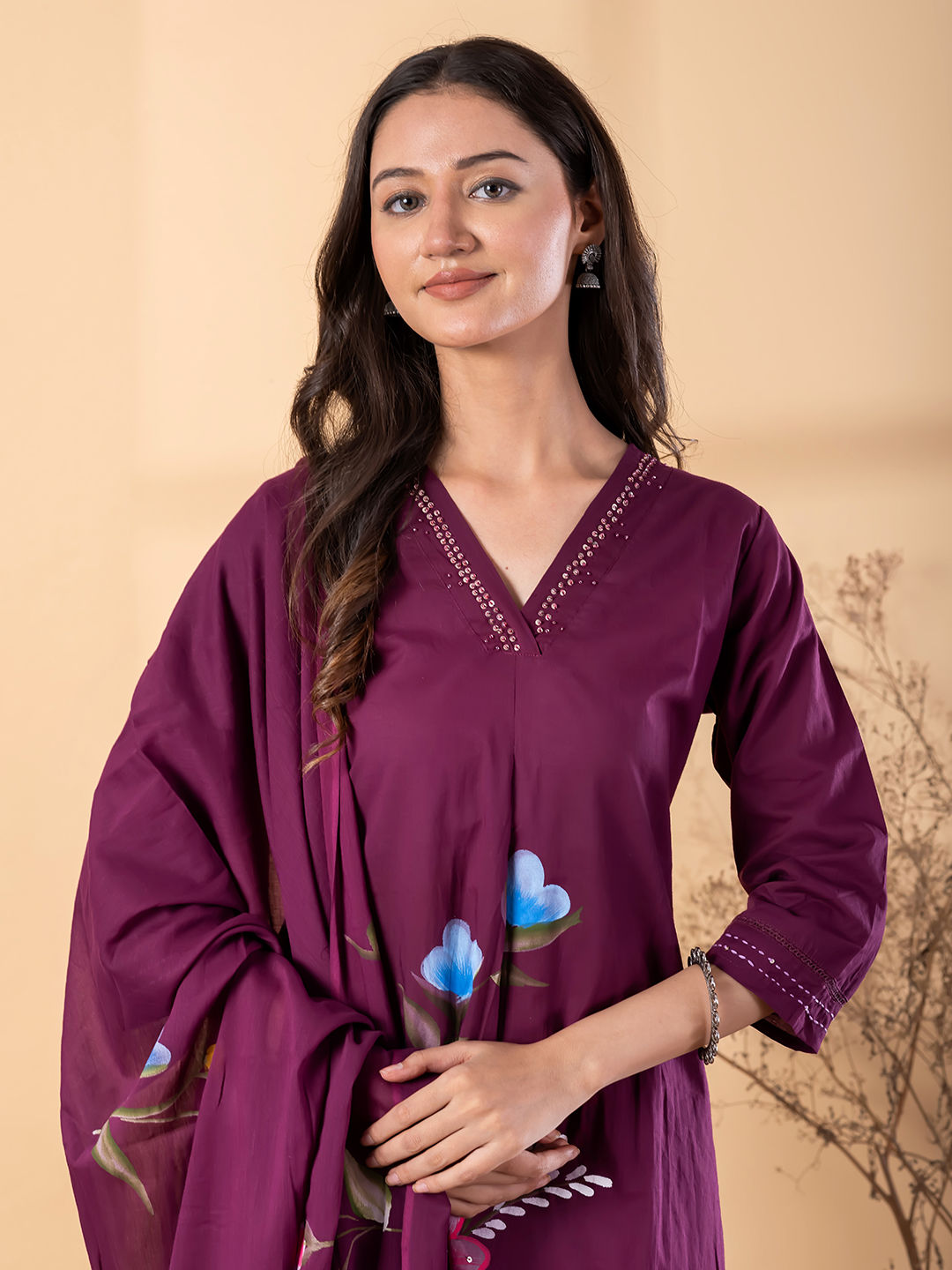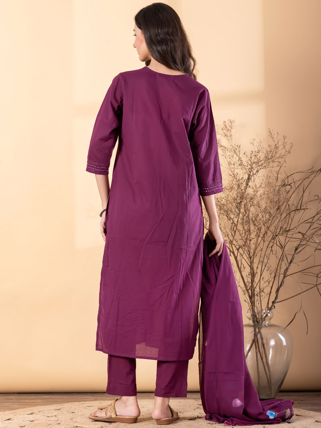 Straight style cotton fabric maroon color kurta and bottom with dupatta