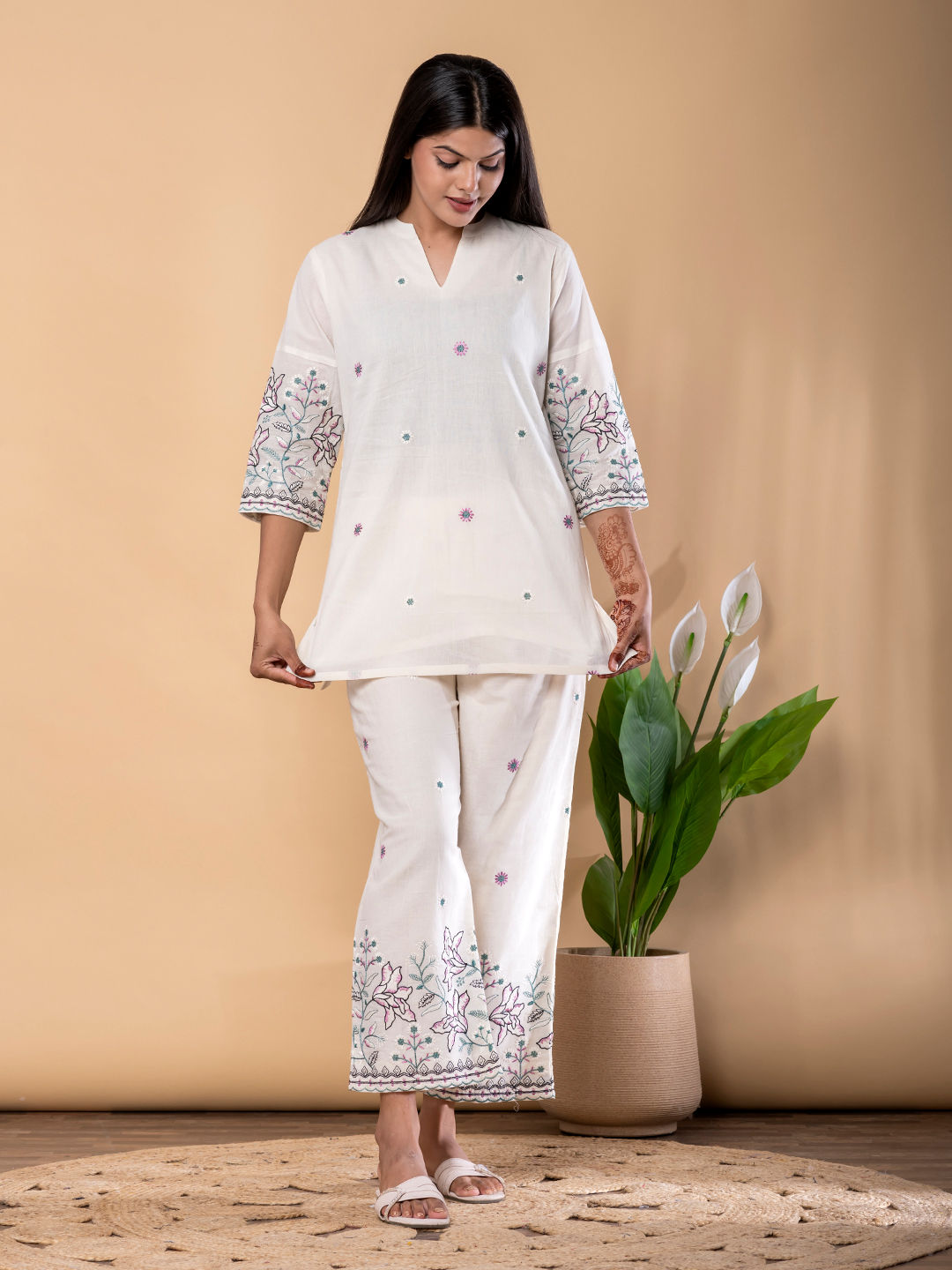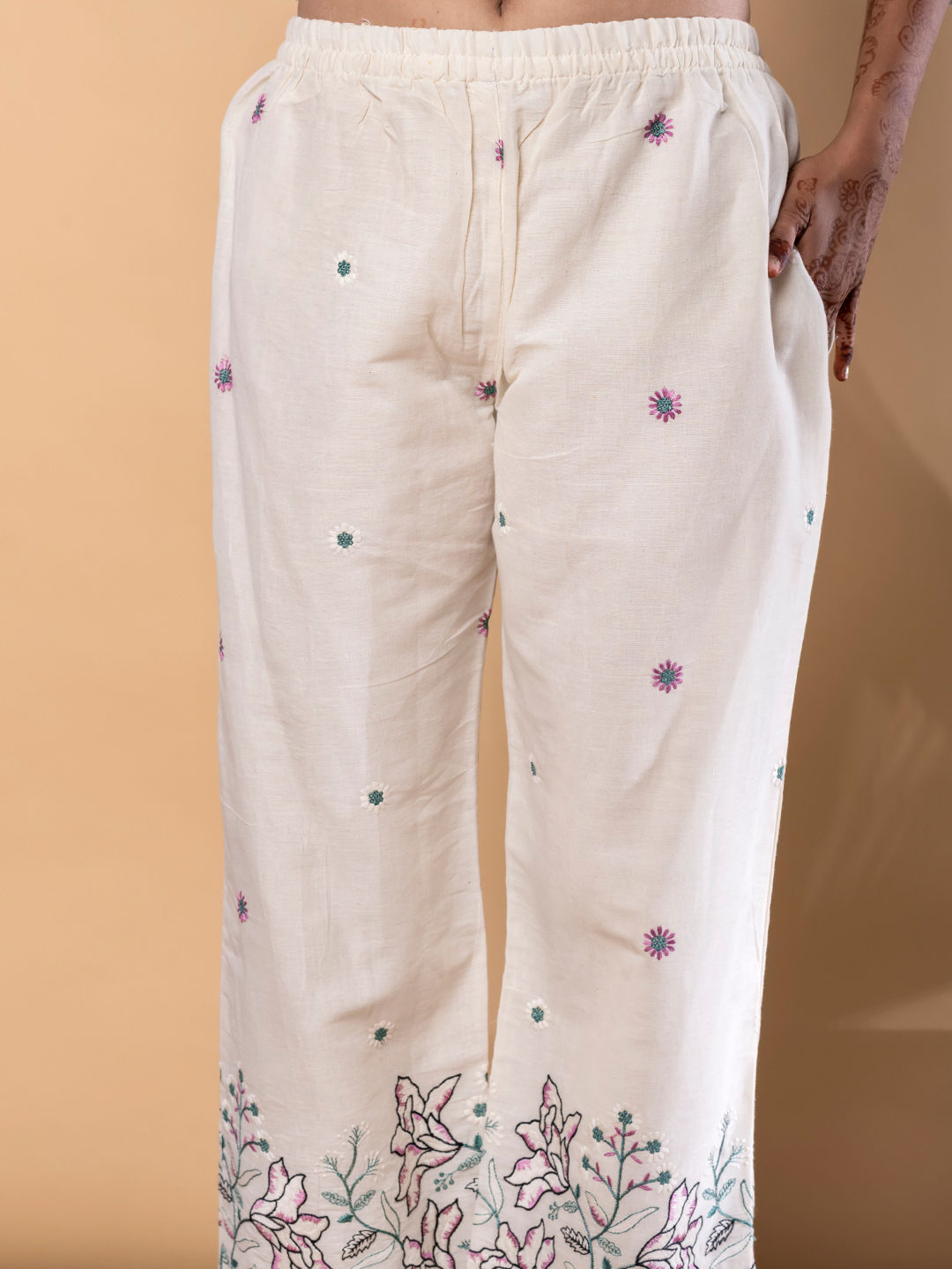 Women Straight Style Cotton Fabric Off White Color Embroidered Work Kurta And Bottom