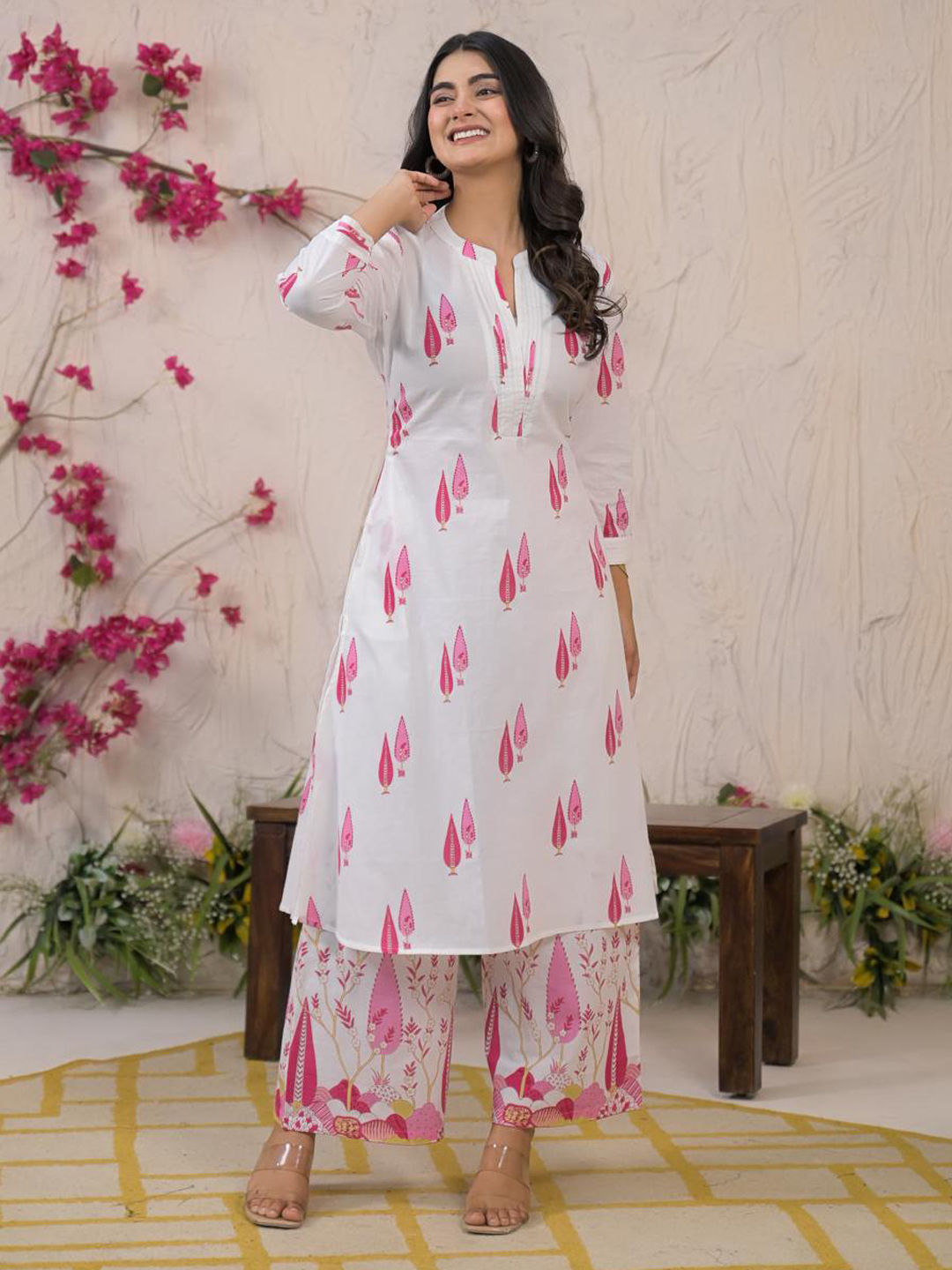 Straight Style Cotton Fabric Pink Color Printed Kurti With Palazzo And Dupatta