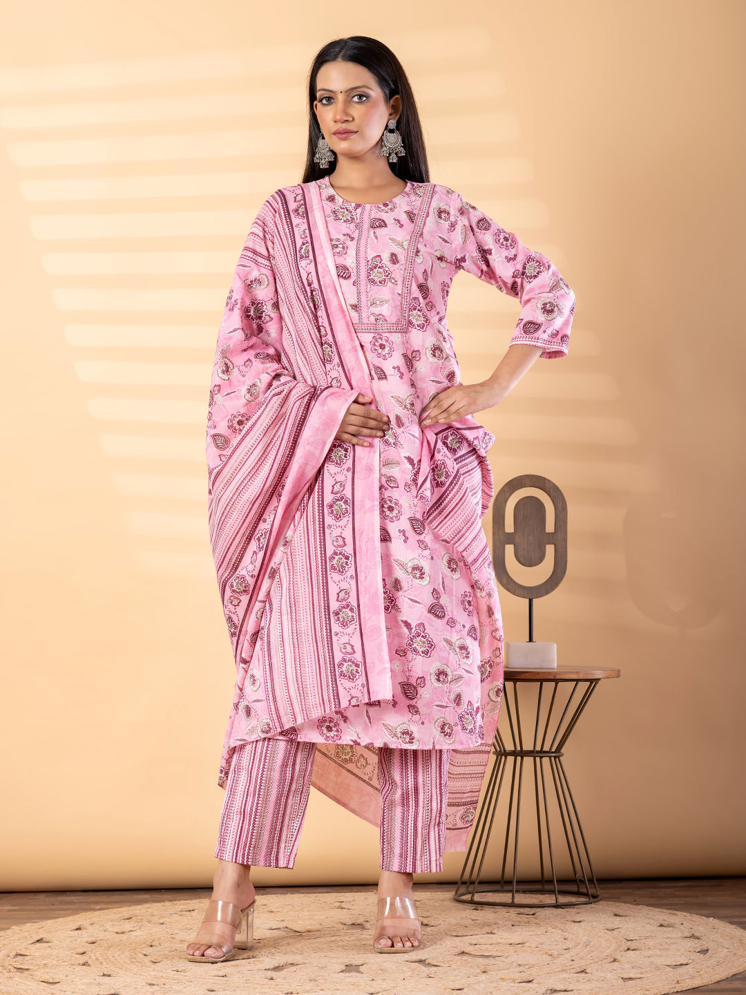 Straight style cotton fabric pink color kurta and bottom with dupatta