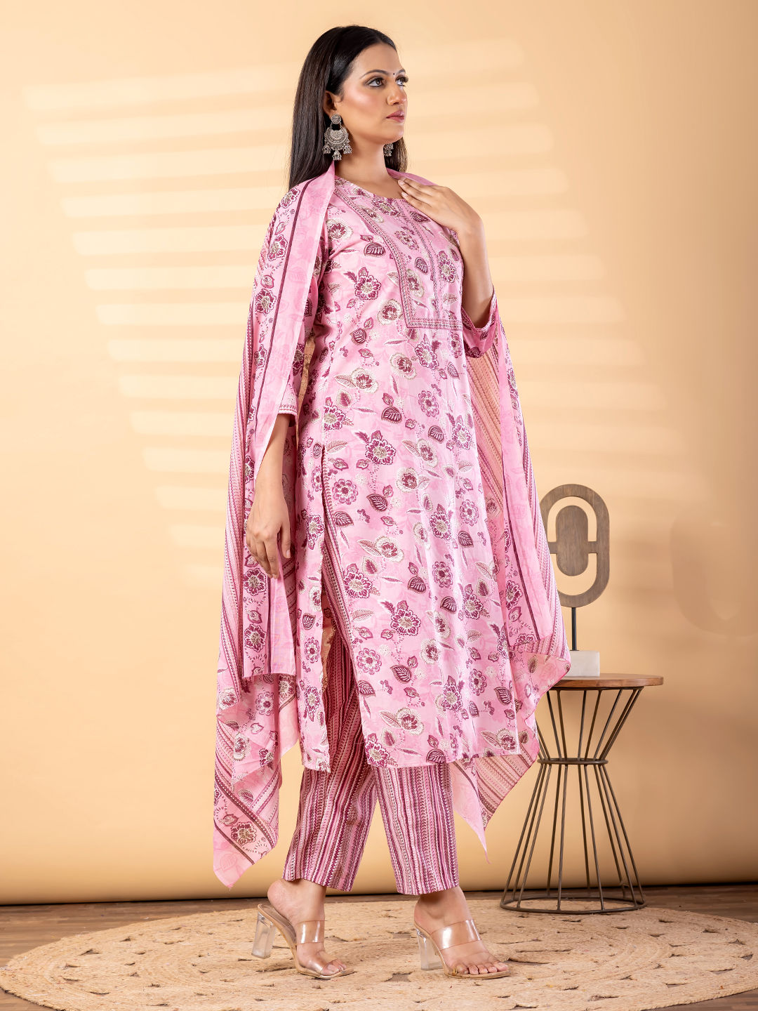 Straight Style Cotton Fabric Pink Color Printed Kurti With Palazzo And Dupatta