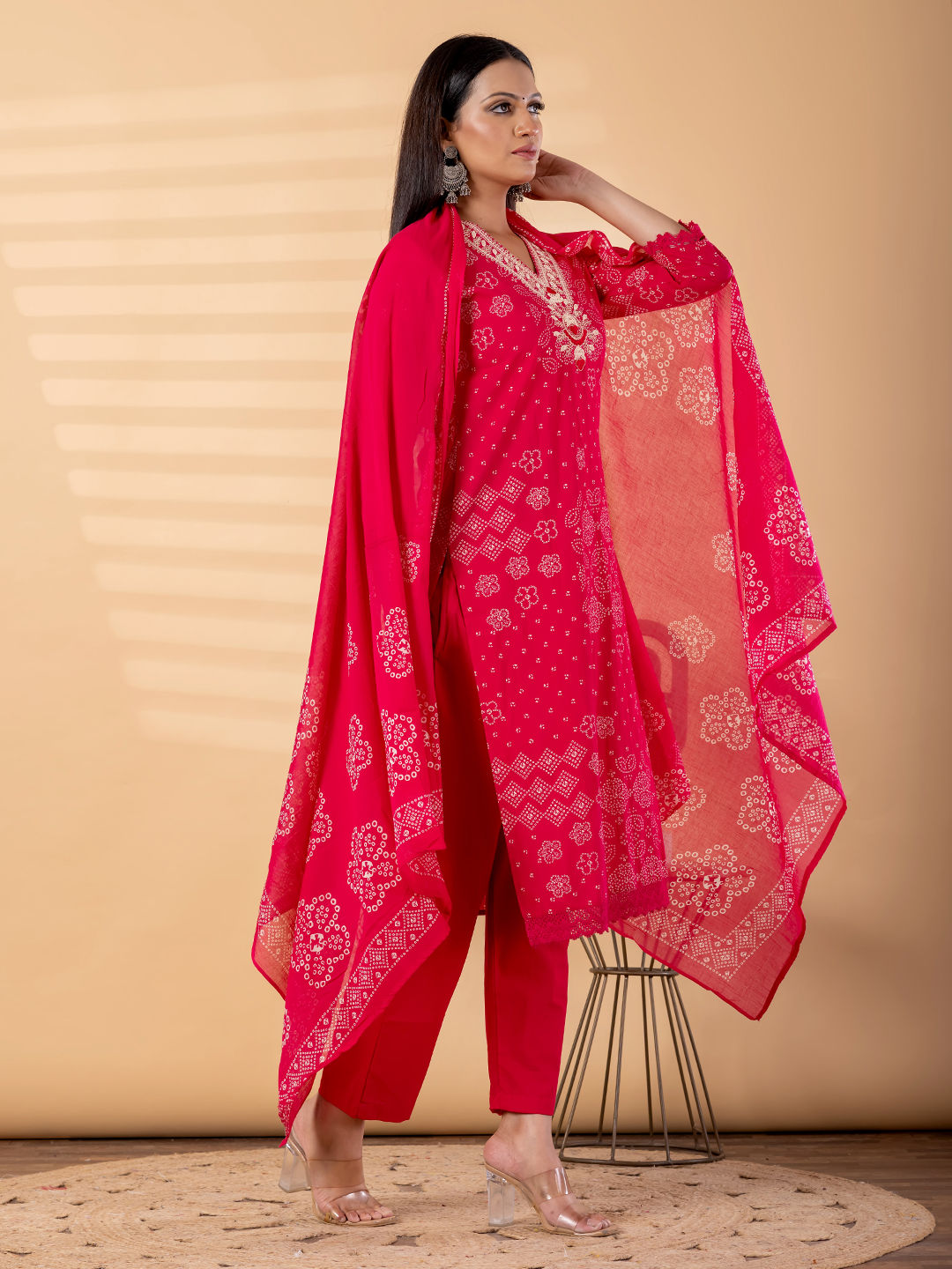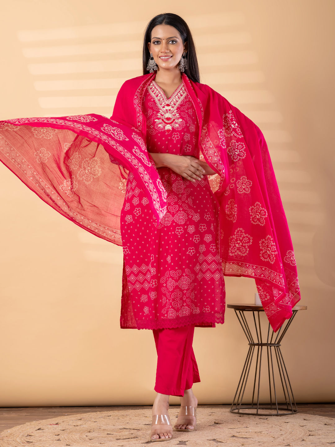 Straight Style Cotton Fabric Pink Color Bandhej Printed Kurti With Palazzo And Dupatta