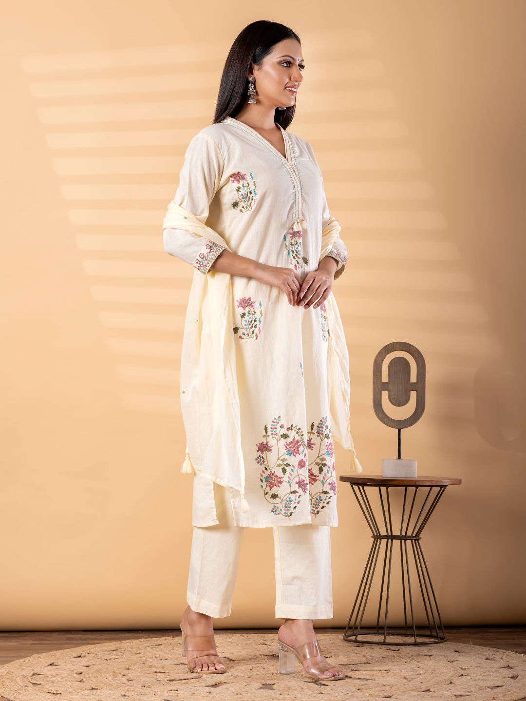 Straight Style Cotton Flex Fabric Cream Color Embroidered Work Kurti With Palazzo And Dupatta