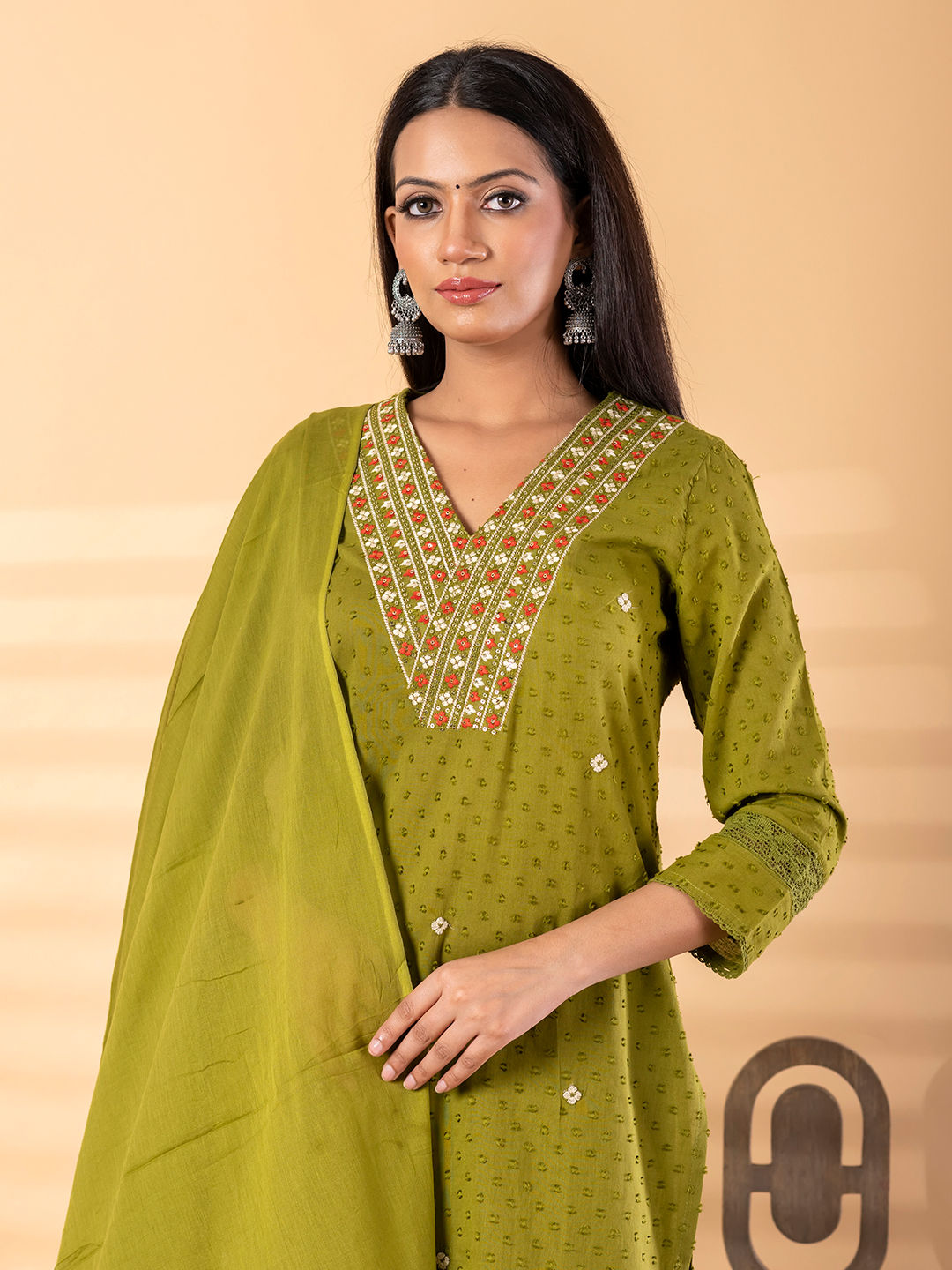 Straight style dobby cotton fabric green color kurta and bottom with dupatta