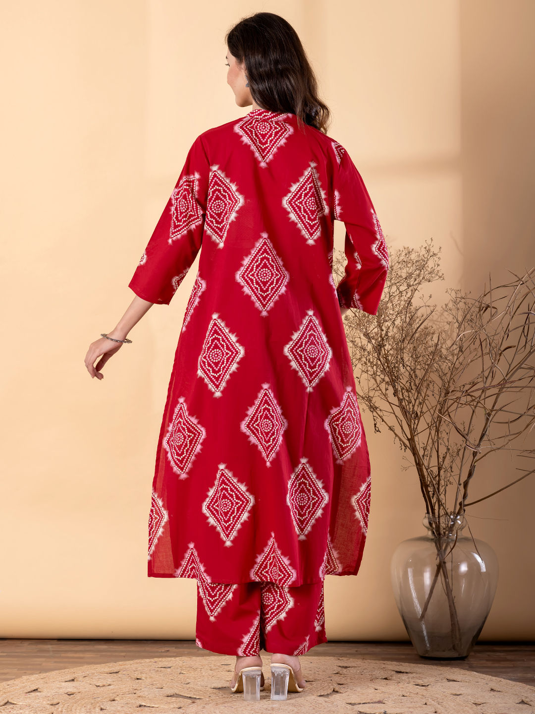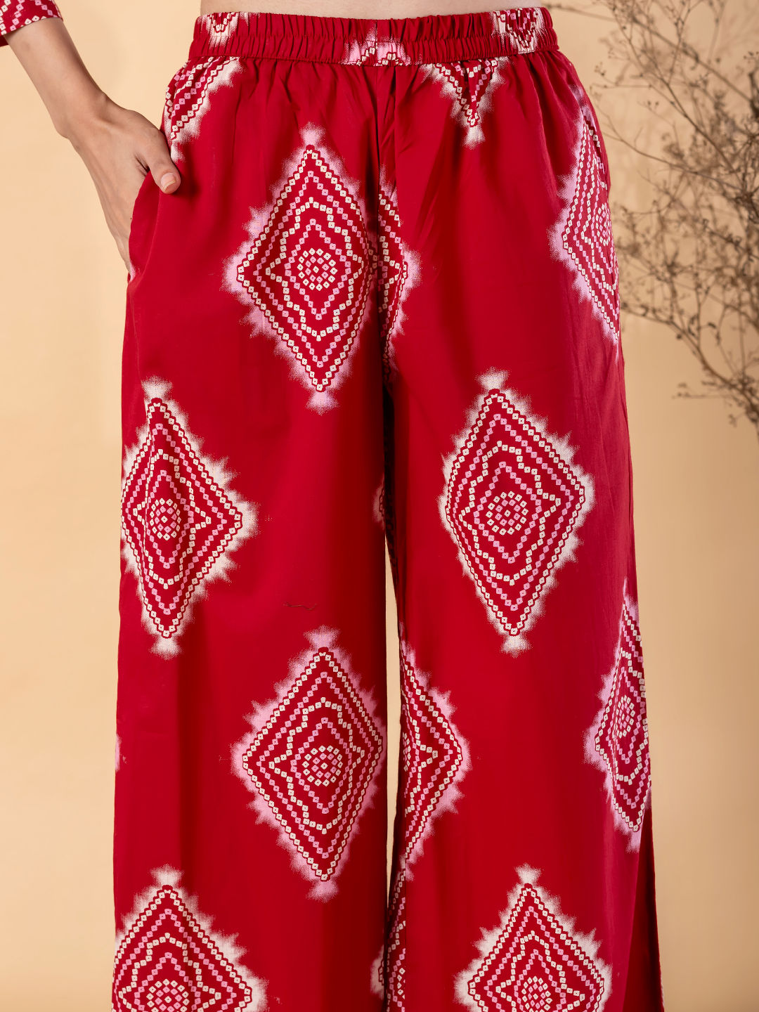 Straight Style Cotton Blend Fabric Maroon Color Bandhej Printed Kurti With Palazzo
